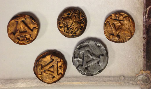 I made these coins out of flat washers and Formula P3 Brown Putty. I used a stamp of the Khadoran anvil to mark one side of the coins and sculpted designs into the other side.