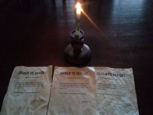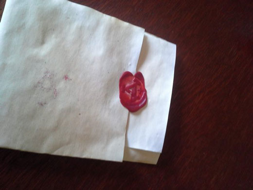 The group I GM for can only get together about once a month, so we do as much as possible between sessions to keep the momentum going. For our most recent campaign (a Greylord adventuring party from Kings, Nations, and Gods), the player who has been designated as the Greylord Magziev sent out weathered, official-looking paperwork to his retinue.