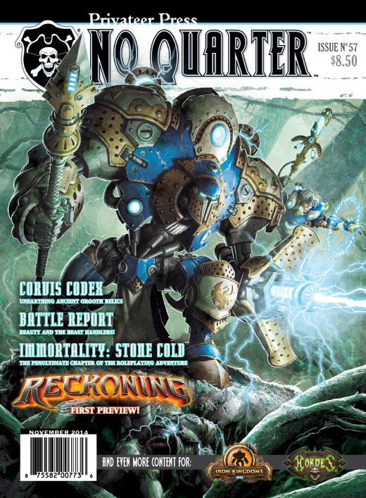 If the readers have played through “Undeath Metal” (No Quarter #53) and “Act of Murder” (No Quarter #54), they already know who Iokav is and this is a clue for what is on the horizon in the last part of the adventure. For readers who aren’t playing the RPG, wait until you see what Rob Hawkins does in issue #57’s “Modeling & Painting” with Eiryss and what Stuart Spengler does in “Terrain Building” with farrow.