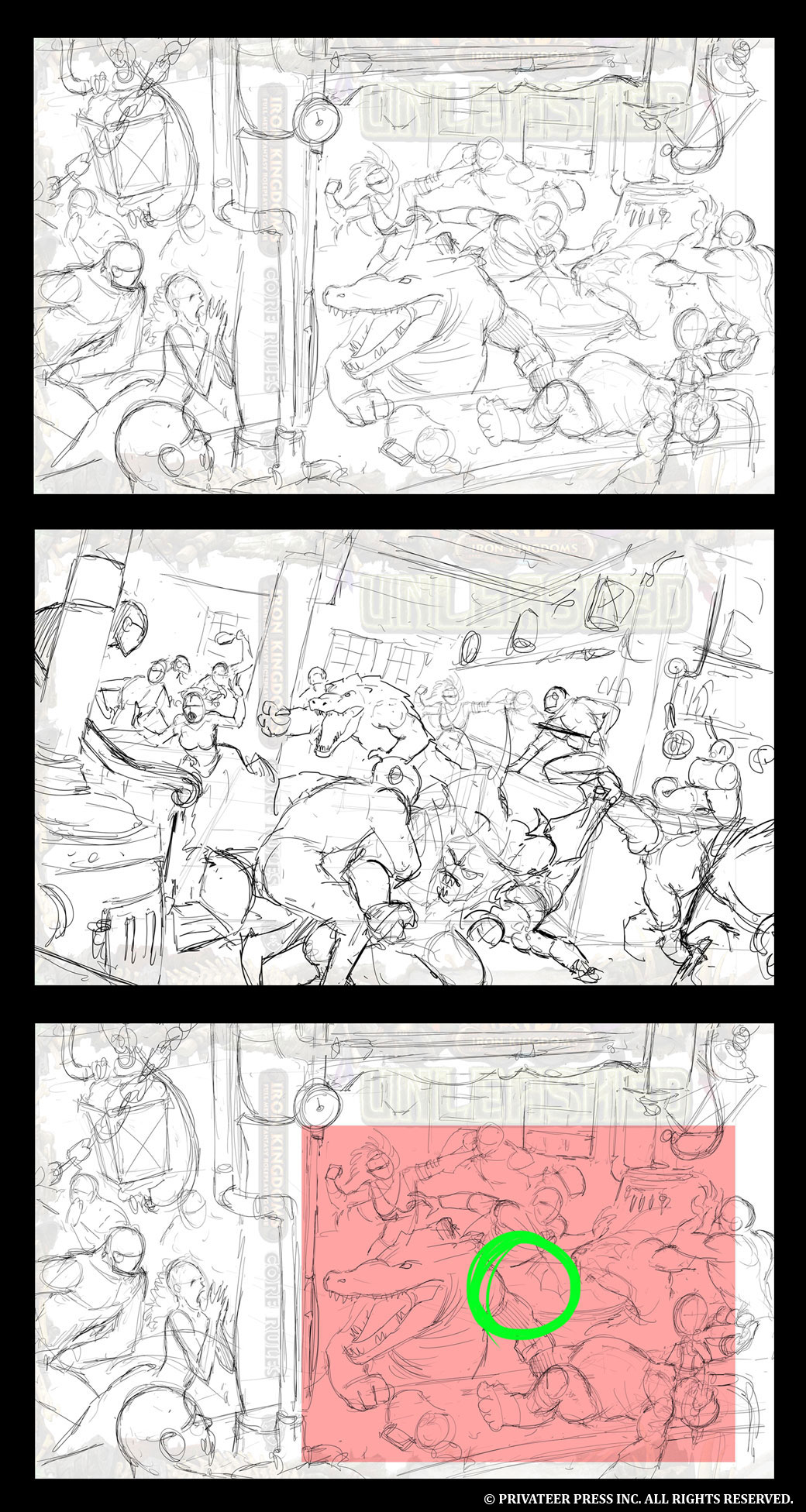 Now that you have a bit of an idea of how the front and back covers work out, we can focus on the composition. I really liked Andrea’s idea of a large pipe or bar element resting underneath the spine treatment. Another thing I needed to ensure was that the creatures be the focal point—they should look like they have the upper hand. And this should help you visualize the right side of the art in the red area as be our primary image area, the first thing you see when you look at it on a shelf. I liked the gator being the central focus, and I liked the bog trog appearing in the foreground, but we needed to fill the void in the middle of the composition where the green circle is. Andrea did a few more rough sketches with that feedback in mind, and he sent me these pieces.