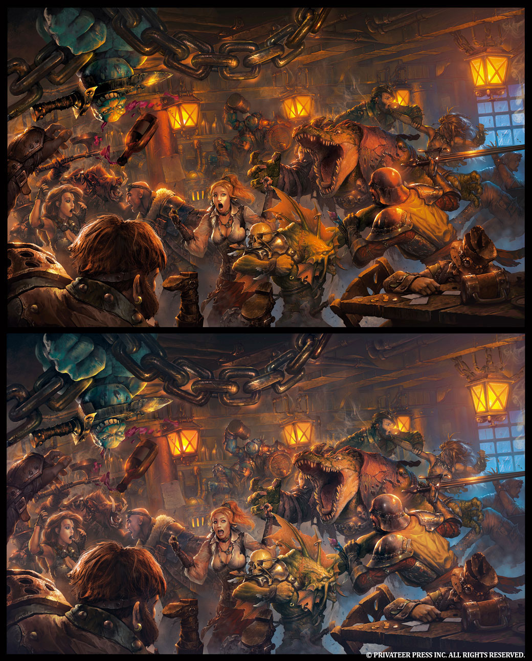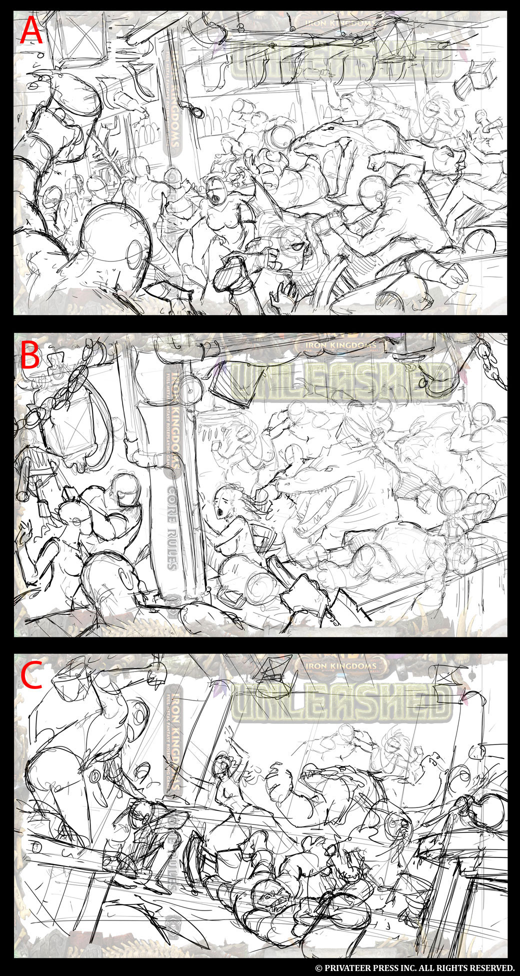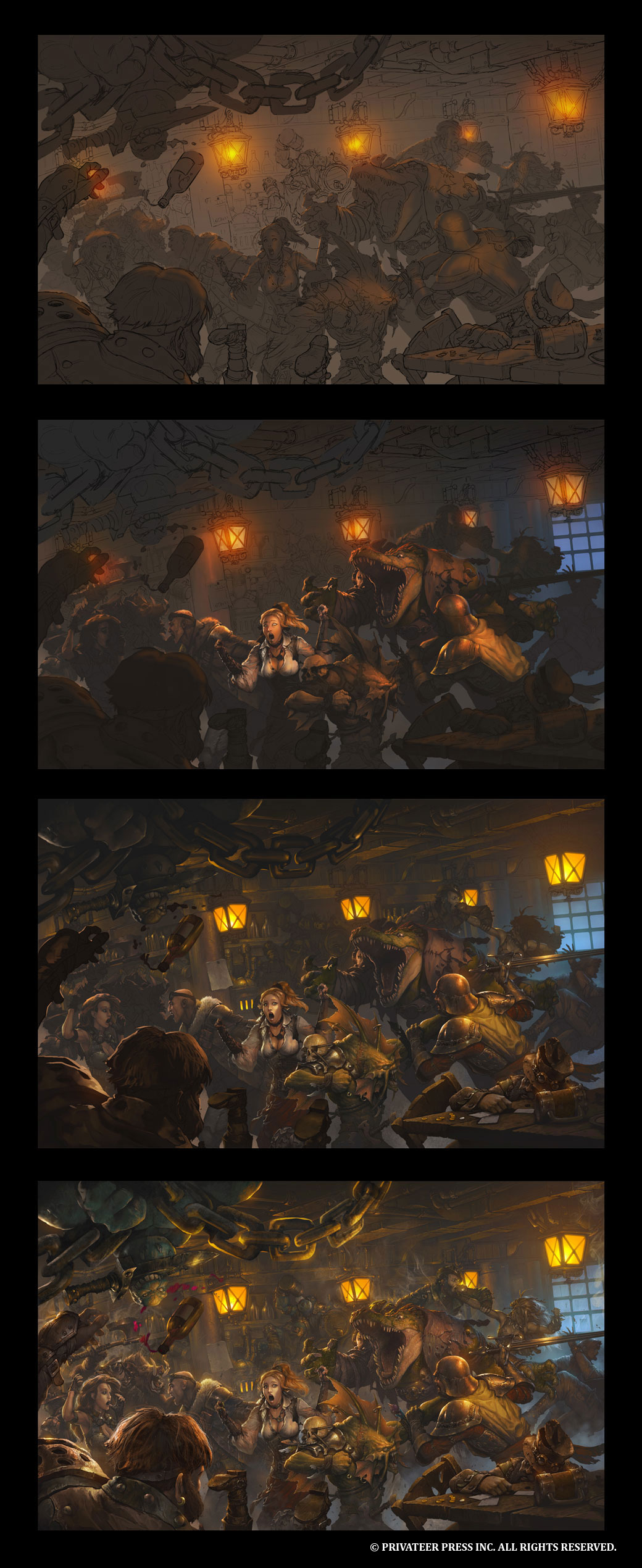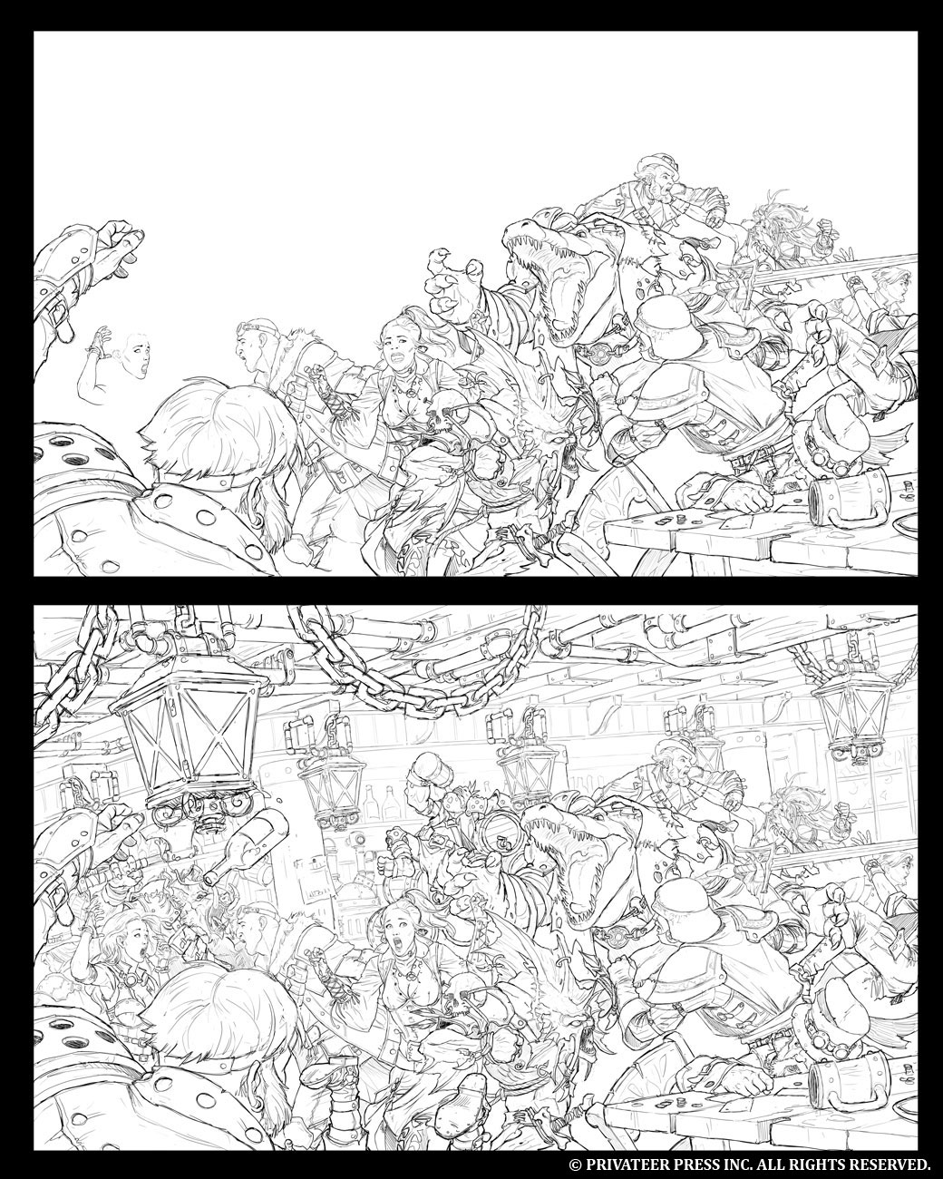 In today’s blog, I’m going to discuss the cover for the upcoming Iron Kingdoms Unleashed. This illustration was a collaborative effort between Andrea Uderzo and Néstor Ossandón. When we originally conceived the idea for the cover art, we knew we wanted a big bar fight scene where a group of non-city/town dwellers were wreaking havoc. During the initial discussion, I wanted Andrea to do the line art and Nestor to handle the paint.