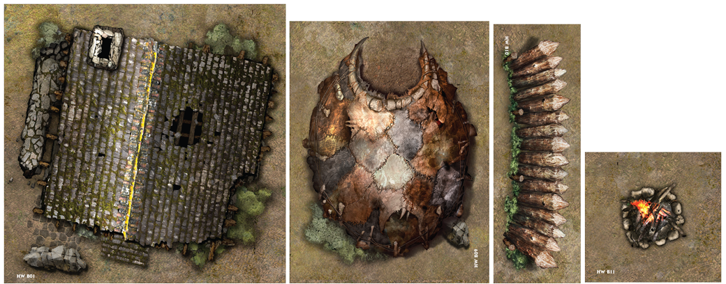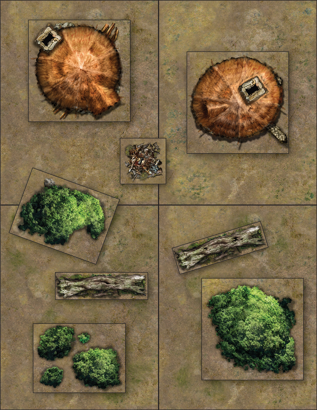 The customization options don’t end there, though. The map tokens include a selection of primitive huts and timeworn buildings, bridges and shallow fords to cross the waterways, smaller clumps of woods, rocky outcroppings, and more. These tokens will bring lots of character to your own encounters. They’ll also add some depth to combat encounters, providing lots of places for antagonists to hide and combatants to take cover or otherwise use to their advantage.