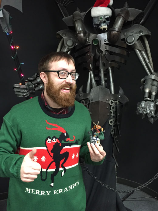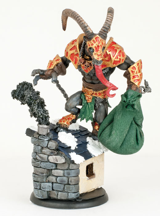 As promised in my previous blog, I have made the most festive of holiday miniatures: the dread Krampus! This project sort of sprawled. Initially, I was just going to slap a Night Troll’s tongue on a Shadowhorn Satyr and paint it up, but things got…complicated after my coworkers started pitching in with excited and possibly ill-advised ideas. After Will Hungerford demanded I add a sack for the Krampus’ victims, Charles Agel jumped in and offered to craft a special base. I could go on, but really, it’s best seen and not told.