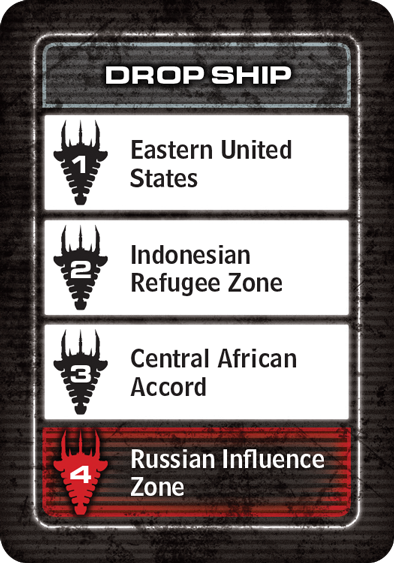 One of the biggest hurdles you can encounter when designing a game is being too close to it to see when something should be dropped in favor of a different idea. The rules for spreading Hydra from the three dead zones got very complicated in the first few weeks of design because they were not working the way I wanted them to. The war wasn’t fluid enough, and there were too many territories that felt too safe. I was beginning to get the feeling another system would work better. but I wasn’t ready to give up on what I had yet. During the next week, at least two conversations came up after playtests in which different people brought up the idea of drop ships. I had also begun thinking in that direction because I wanted the warfronts to shift more. After I heard it from multiple people who had played the game, I decided drop ships were the way to go.