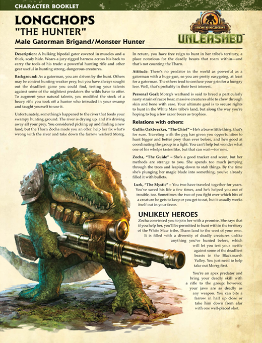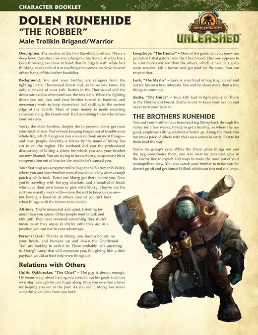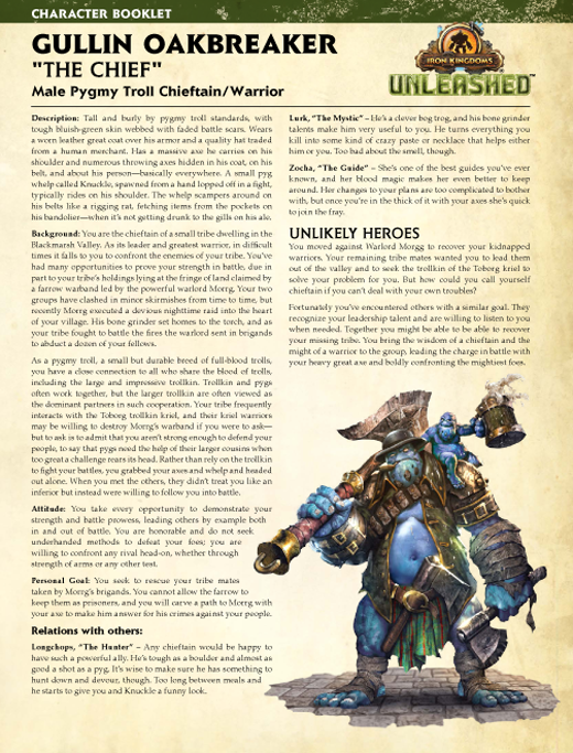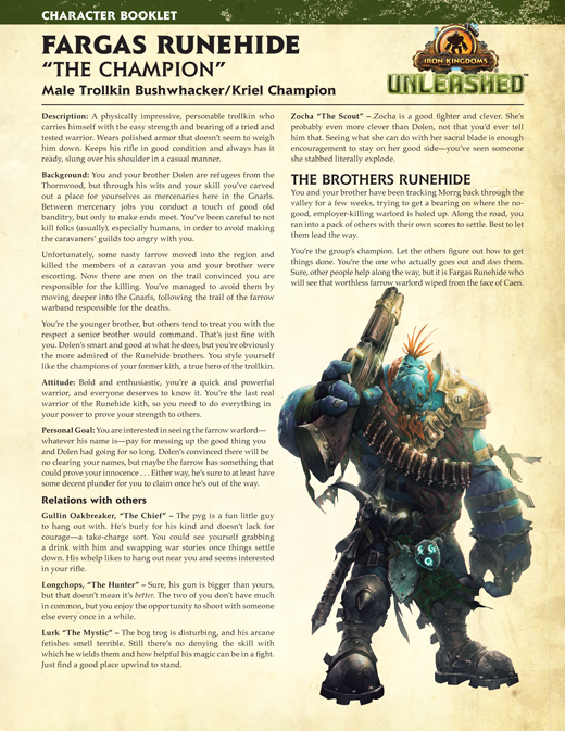 To wrap up this segment of Unleashed Fridays, we are happy to present two new pregenerated characters for the Hogwash scenario, Dolen and Fargas Runehide. Perfect for groups with more than four players, these two characters are presented with the same level of detail as the heroes in the Unleashed Adventure Kit. Players who want to keep their character booklets in pristine condition can download the Runehide brothers and all the other Unlikely Heroes by clicking the images below.