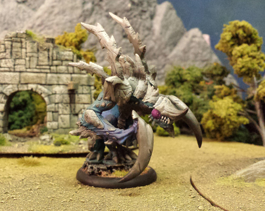 As you can see, I didn’t stick to the traditional paint scheme. To help me achieve this look, I primed my models white and then used an airbrush to create the gradient. Next, I painted the entire model with Meredius Blue. After it dried, I airbrushed the bottom two-thirds in Cygnar Blue Highlight. Then I applied Beaten Purple to the lower third. For my warbeasts, I used Bastion Grey on the spikes and spines.