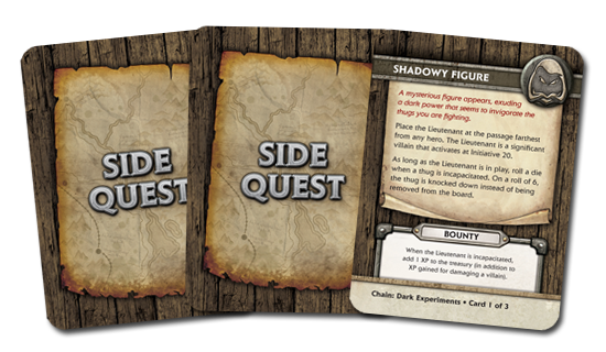 With the chapters and the Event cards in place, we had most of the final game working well—but there was one more RPG concept we wanted to add. Every great adventure has a strong main plot, of course, but they almost always have side stories as well, secondary events that happen within the same time frame as the main story. For this added dimension, we introduced a set of cards called Side Quests into the game. A Side Quest might take the form of discovering random loot, facing new villains, or engaging in a minor subplot. A Side Quest card is found only by going off the beaten path, at the edges of a chapter’s map, which means a hero must divert his attention from the main goal of the chapter in order to find and use it. To sweeten the deal, we made sure these cards provide heroes with ways to gain advantages over the villains—or at least some extra XP.