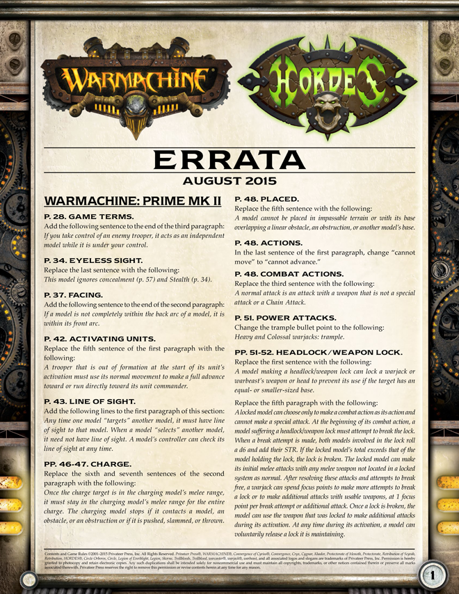 As the lead designer of WARMACHINE and HORDES, I wanted to take a moment to discuss the newest errata document. An astute reader will notice a number of balance changes across the games. It is our intention that these changes both improve balance and the experience of play. These changes were not made lightly, however—they are the product of solid feedback, direct play experience, careful consideration, and continual debate.