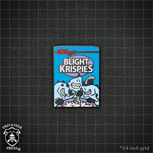 Finally, we’re a little out of order this month—we needed a bit more time on our Cereal #5: Quakehammer Oats pin, but we’re plowing ahead with Cereal #6: Blight Krispies anyway! Snap, crackle, and pop take on a whole new meaning when your breakfast table is surrounded by shredders.