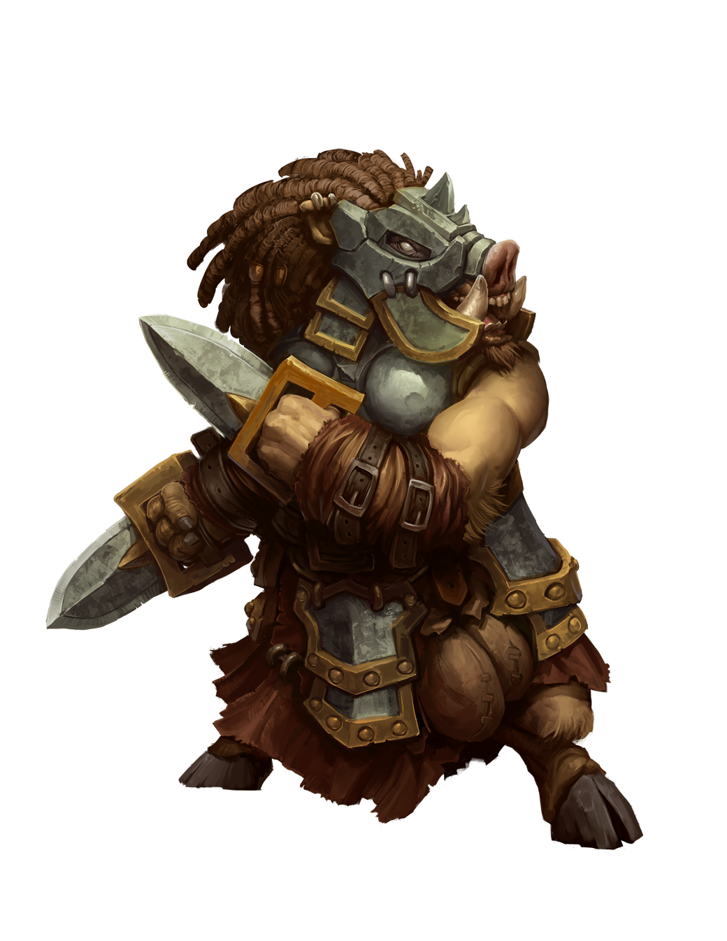 Next on my list for the heroes was a main-line melee character. Gardek and Doorstop share this role in The Undercity, each handling things in their own way. This new character would need to shoulder most of the work on her own—“her” because, along with talking about who the characters were, we had a few discussions to determine which ones would be male or female. The Iron Kingdoms is a realm frequently rocked by conflict and its inhabitants can find themselves fighting for their own survival and the survival of their people. The physiological differences between male and female Tharn necessitated that Skarg be a male, but we had no similar restrictions with this character. The boar-like farrow race is one of my favorite aspects of the Iron Kingdoms setting, and within its tribes the slaughterhousers are some of its most capable fighters. So, when choosing who would be up in the villain’s faces to save the Widower’s Wood, I created Agata. She fights with a pair of bladed gauntlets and a set of abilities that let her stand toe-to-toe with any villain.