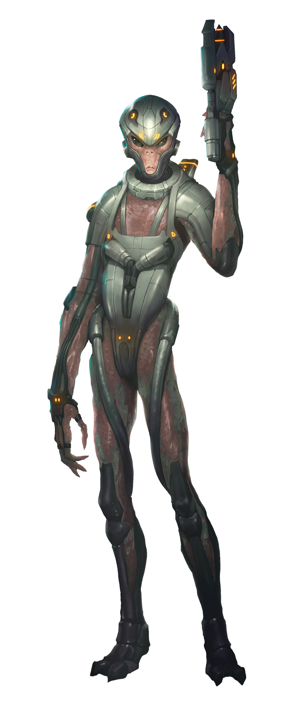 Everything that exists in the setting started with LEVEL 7 [ESCAPE]. In that game, we jump into the story just as the relationship between the U.S. government and the Ghin refugees has been pushed to its breaking point. As the story progresses, we see that relationship fracture and implode. The game also presents a very guarded Dr. Cronos, who has kept many secrets. During Omega Protocol, we see many of these military secrets in the form of weaponized servitors Cronos never shared with his human allies. As we were exploring the militarization of the Ghin during development, we talked about Cronos himself. We briefly considered decking out the Ghin leader in a suit of high-tech armor and giving him a gun, and we even went so far as to concept what that would look like. But in the end, we decided Cronos was above getting his hands dirty and chose to portray him in his alien lab coat. We had a great piece of art and expansion plans, so we decided to commission a sculpt of the armored Ghin, along with the rest of the enemies, and save him for the future.
