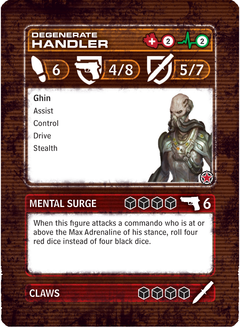 All of that backstory means the Ghin warden is the oldest component of the expansion, but I didn’t know exactly what to do with him when work started on the project. Eventually, we decided that if Cronos were establishing a new base with limited support from another government while under threat of constant attack, he would bring more of his people out of stasis. In the core game, the commandos were surprised by the sudden appearance of Ghin handlers. So, at this point in the story, Ghin trained and armed for war would be less of a surprise and create a natural escalation in the conflict.