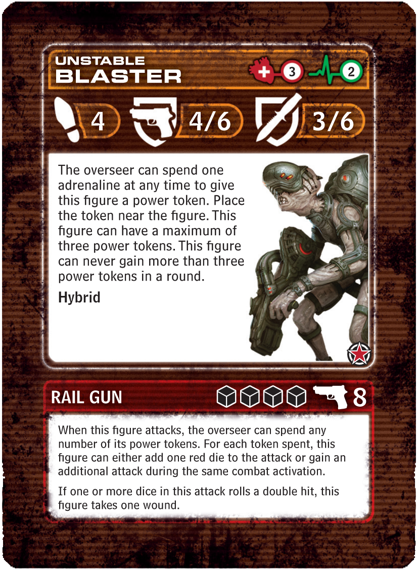 When designing the rules for the warden, I focused on flexibility. These Ghin are veterans of the war against the Hydra, who attack our world in LEVEL 7 [INVASION]. The Ghin lost their war and fled their empire 100 years ago, but that didn’t make their warriors pushovers. I established the warden’s threat by giving it formidable weapons: both a melee claw and a ranged pistol. This gives the overseer the option of attacking a commando’s weaker defense stat. Then, I gave the overseer the option of rolling more dice by spending more adrenaline when a warden attacks. This makes them much more accurate than most enemies. To push the danger to the limit, I created an ability that would give this enemy a chance to do more than one damage to a commando with a single attack roll. All of that makes the warden a frightening opponent, but it still needed something else. A powerful defensive ability was missing. Once that ability was created, the warden was ready for action. To get the most out of him, the overseer must spend adrenaline, but it’s well worth the cost.