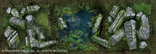 While The Undercity explored the sewers below the city of Corvis, Widower’s Wood plunges you into fetid marshes and bogs—an environment that is practically an enemy itself and one that your enemies will use to their advantage. Lying in wait to ambush you, amphibious bog trogs hide in water spaces, safe from retaliation beneath the liquid cover. Dense vegetation presents a challenge to movement and blocks ranged shots at the villains lurking beyond them. Ritual circles and ancient ruins pepper the landscape, unleashing dark powers and acting as magnets for evil energies. Vines shoot forth from thickets, ensnaring the unwary, and leeches fill wet grass and puddles, draining the life (or at least the feats) from you.