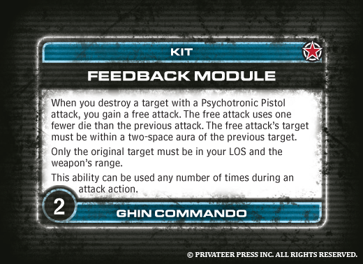 I also wanted to explore ideas that didn’t fit in the power sets of the heroes in the base game. OMEGA PROTOCOL is a dungeon crawl at heart, but because it’s a sci-fi game, we don’t get to do things that would fit better in a fantasy game. This last preview card is my favorite. Since the Ghin Commando’s pistol is built with psychotronic tech, it can operate on the mental wavelengths of the enemies. This allowed me to put something into the game that I jokingly called psychic chain lightning during playtest.
