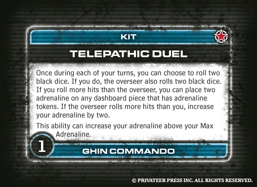 In addition to interacting with the creatures on the map, I wanted to give this character a unique interaction with the overseer player. A large part of what the overseer does represents the behind-the-scenes actions of Dr. Cronos. Some other abilities in the game can affect the overseer’s choices when activating dashboard abilities. The Ghin Commando can use his mental powers to directly attack the dashboard.