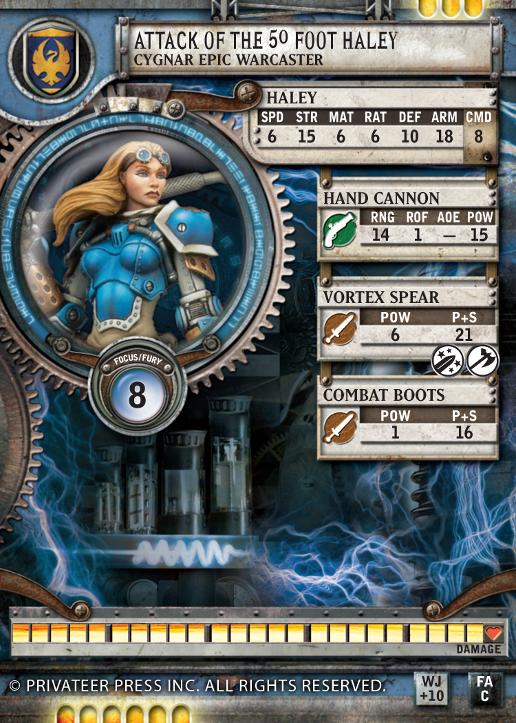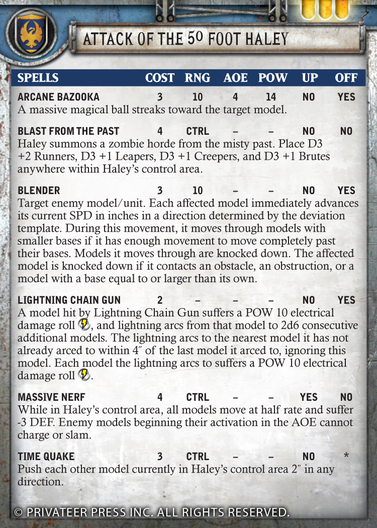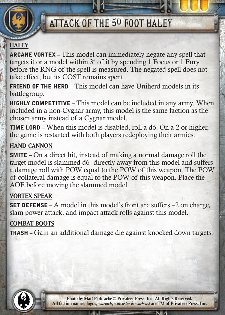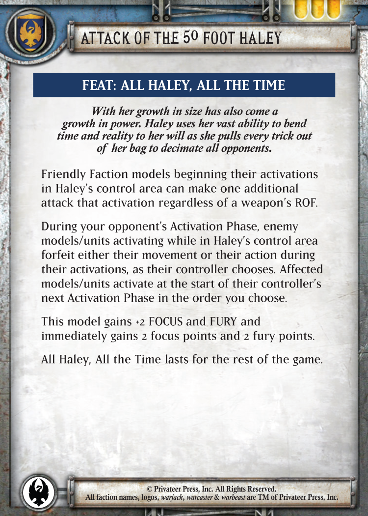 That’s right! With All Haley, All the Time, you never have to worry about when the right moment is to pop her feat. Because with Haley, it’s always the right time! On top of that, in order to make sure that no one felt left out in the cold, Haley 4’s Highly Competitive rule means that you can terrorize your foes with 50´ of Haley no matter which faction you play. Just one look at her rules, and I’m sure you’ll agree this breaks new ground and shatters every preconceived notion about what a WARMACHINE and HORDES model can be.