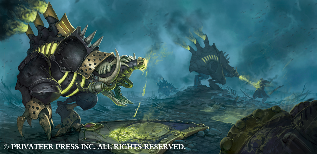 For any model entry, I like to see the models interacting inside an environment where they demonstrate their battlefield prowess. In this illustration by Jonathan Gonzales, I wanted to see the Defilers melting a combined Cygnaran and Khadoran force, giving a little bit of a nod to the events that transpired back in Reckoning. You might notice the lancer shield and cowling in the bottom third of the frame, and middle right you’ll see a Khadoran Winter Guard getting sprayed with acid. That poor guy never had a chance.