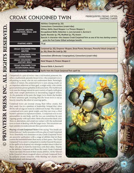 Career options are also short. A full-fledged career requires a full page in layout, but we can fit four or five career options in the same space. Figuring out which concepts work better as options to existing careers gives us more flexibility and lets us include many more concepts in a single book. Career options can also be incredibly specific, letting us provide greater detail about the inhabitants of the Iron Kingdoms.