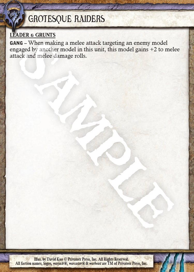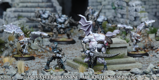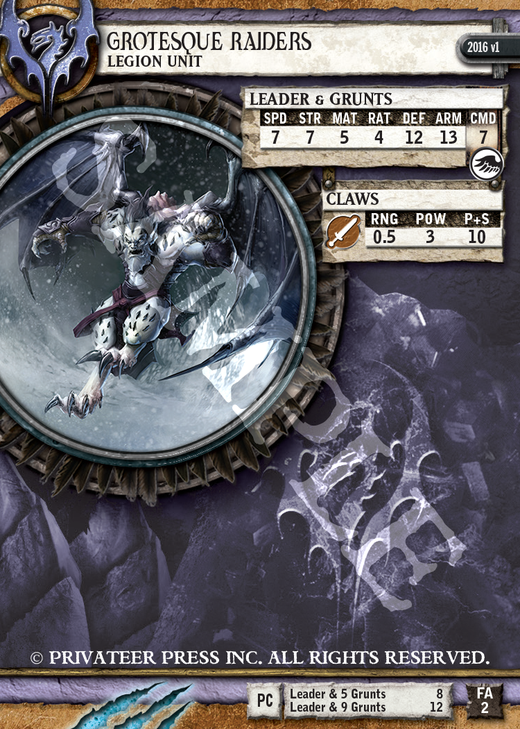 Beyond the warlocks, the majority of Legion units underwent significant rebalancing to make sure they provided compelling and interesting choices alongside Legion’s stable of powerful warbeasts. In nearly every instance, the point cost of Legion infantry was redressed and in many cases reduced to better reflect their potential capability. Blighted Nyss Archers, for example, dropped to a low cost of 8/13. My personal favorites among Legion troops, the Blighted Ogrun also saw a drop in overall cost and picked up Tough (though like many medium-based infantry, they had their damage boxes reduced from 8 to 5). Another personal note of excitement for me was the rebalancing done to Grotesque Raiders, which turned them from an easily overlooked unit into a fantastic, fast, and expendable swarm.