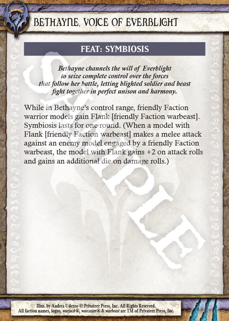 Beyond the more global changes to both Legion and the new edition overall, one of our biggest rebalancing efforts was taking a comprehensive and critical look at the many Legion warlocks and reassessing their specific niche and role within the Faction. This provided us great opportunities to revisit and revitalize each warlock by defining a place and playstyle within the pantheon of their peers. Some warlocks remained just as battlegroup-focused as always. Thagrosh, Absylonia, and Saeryn all remain warlocks who are heavily battlegroup-centric and can push their warbeasts to the limit. In other circumstances, we took the new edition as a chance to really redefine certain warlocks. Bethayne, Voice of Everblight is perhaps my favorite reimagining. As a warlock who has the power to physically meld with her personal warbeast Belphagore, she seemed a prime candidate to step in as the combined-arms warlock, acting as a bridge between warbeasts and warriors within the Legion. Nowhere is this new focus more clear than with her new feat Symbiosis.