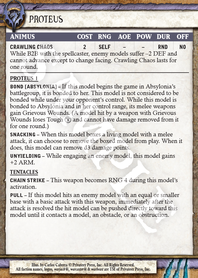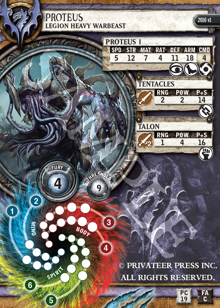 Legion’s warbeasts also benefited in many ways from our in-depth rebalancing and retooling. The Scythean became an absolute infantry murder machine thanks to the Murderous ability—which grants it an additional die on attack rolls against warrior models—and replacing Chain Attack: Bloodbath with Thresher. Proteus in particular has become truly terrifying in the new edition, and I personally can’t wait to get him on the table in a post-Egg Roll world.