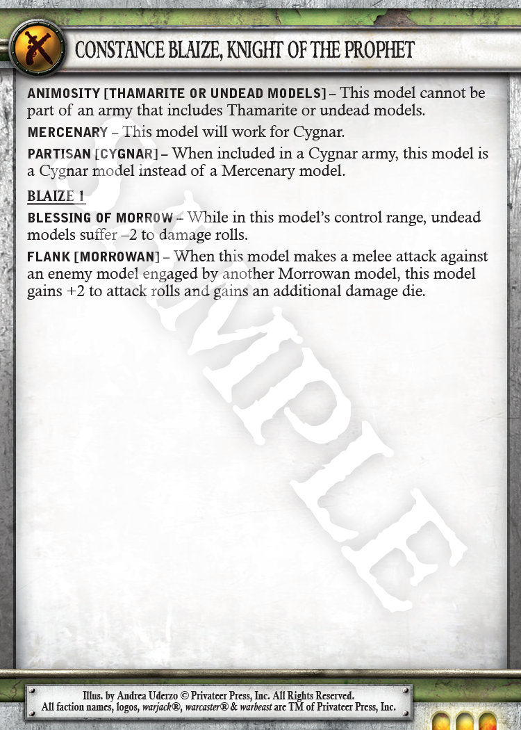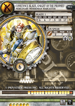 While I’m on the subject of Mercenary warcasters (or at least on the subject of showing off their cards), I want to talk about one of the most changed warcasters in the entire Faction: Constance Blaize. Oh, hey—I guess this technically counts as a Cygnar spoiler, too. Good for them.