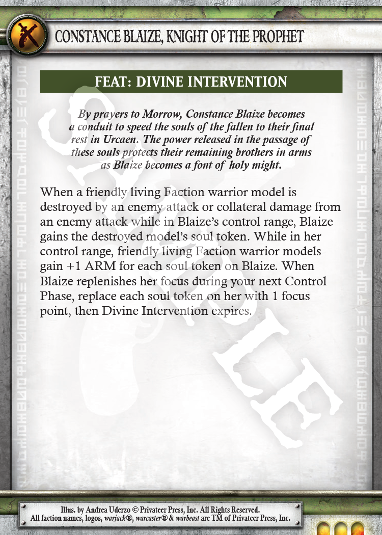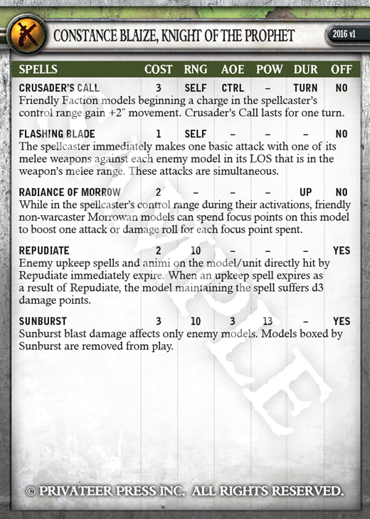 Constance is easily one of the most punishing warcasters an Undead army can face, thanks to her new Blessing of Morrow ability. When you read the card, note that the -2 DMG this ability confers is in her control range, not command range. It’s also -2 DMG on ALL damage rolls. Even exploding Bile Thralls hit softer when in the presence of this holy warrior. Constance also traded her Banishing Ward spell for Repudiate, giving her some much-needed upkeep removal, a trait far more rare in the new edition. Anyway, enough talk! Check out Constance in all her glory!