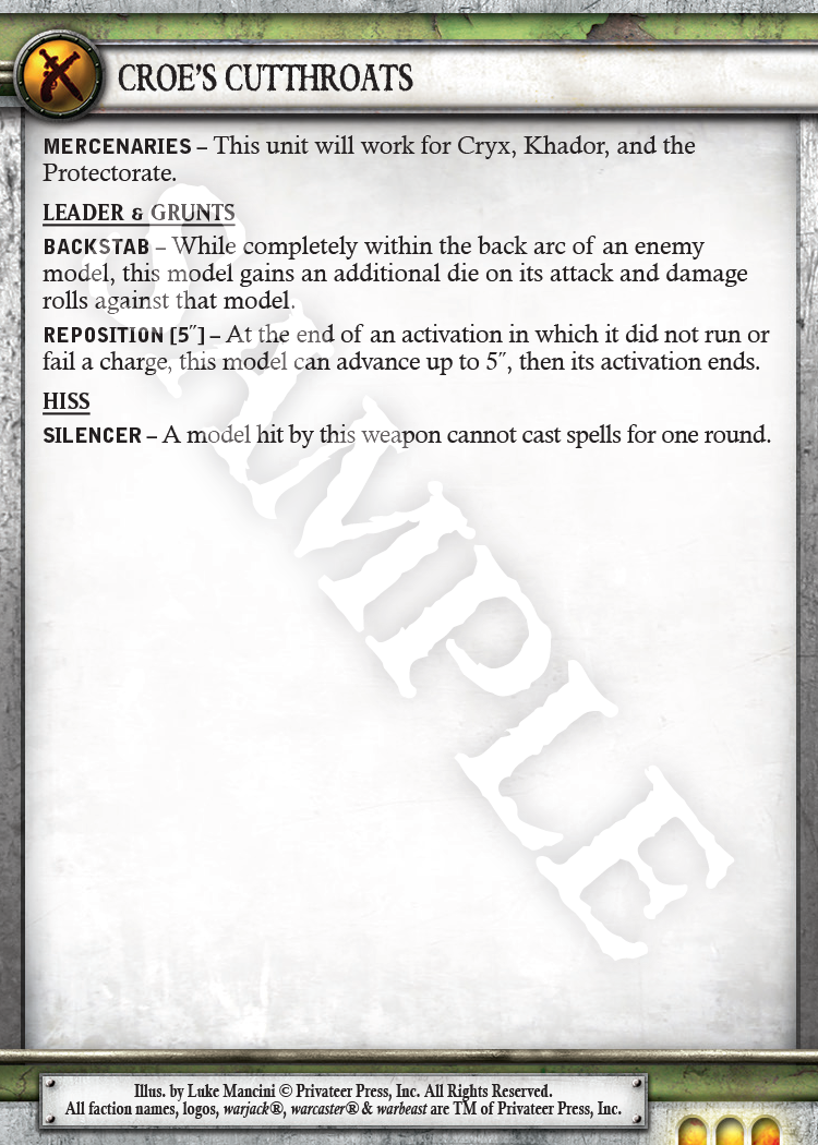 We had to playtest relentlessly to ensure Cutthroats were appropriately costed and did not overshadow other units in the Factions they worked for even without access to Faction specific buffs. A good comparison to look at would be Cutthroats versus Protectorate Exemplar Errants.