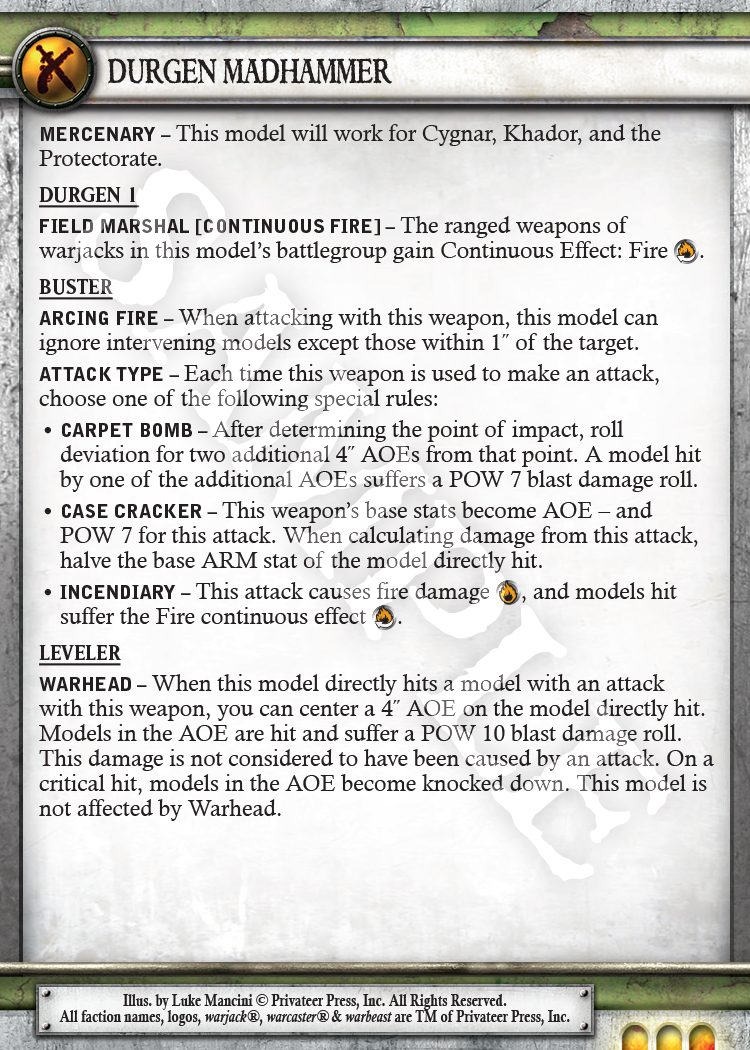 I guess it wouldn’t be very fair of me to mention Durgen Madhammer without also discussing some of his changes. You know what the Rhulic master of destruction was missing? The ability to set everything on fire while the entire battlefield exploded. Luckily, thanks to his new Field Marshal, he can do just that. Check him out.