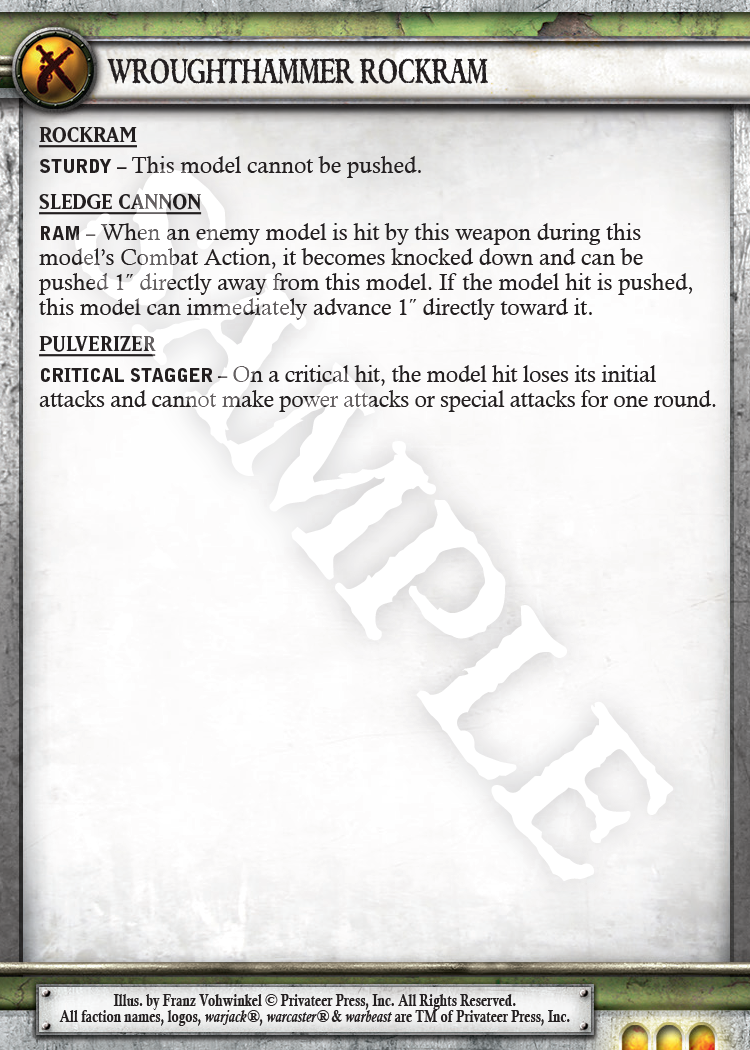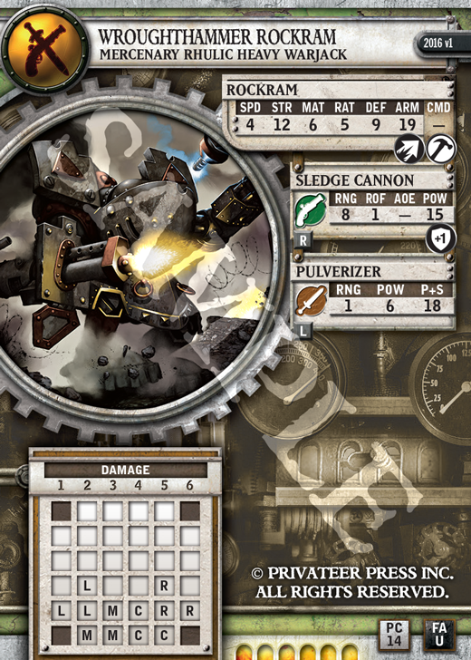 This warjack is an absolute steal for its point value. The Rockram is a workhorse warjack, specialized in nothing, that’s capable of doing a lot of damage on the battlefield. At 14 points, this ’jack is roughly equivalent to 7 points in Mk II. Considering its stats and abilities and the new Power Up rule we’ve discussed in previous Insiders, this ’jack is very efficient for its cost.