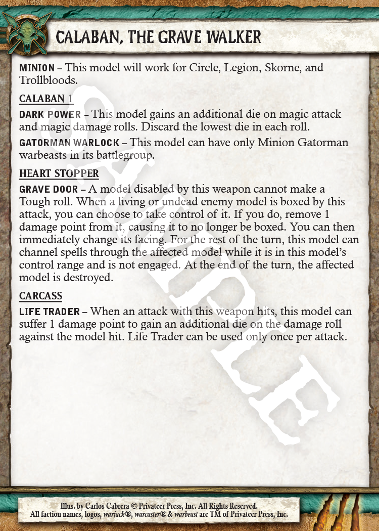 Finally, I want to end this discussion about gatorman forces with a brief chat about the sheer power of their warlocks. I think Calaban will make a great example of how we tried to reinforce the idea that the Gatorman warlocks truly are the driving force behind their entire army, and the primary source of the black magic that turns their army into a bloody murder machine. I’m going to show you the card. First, read Dark Power and the new wording on Grave Door and then come back here.