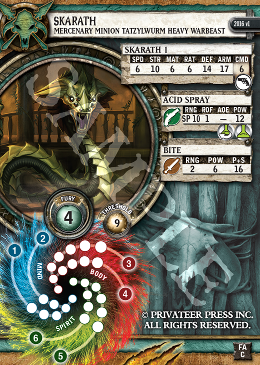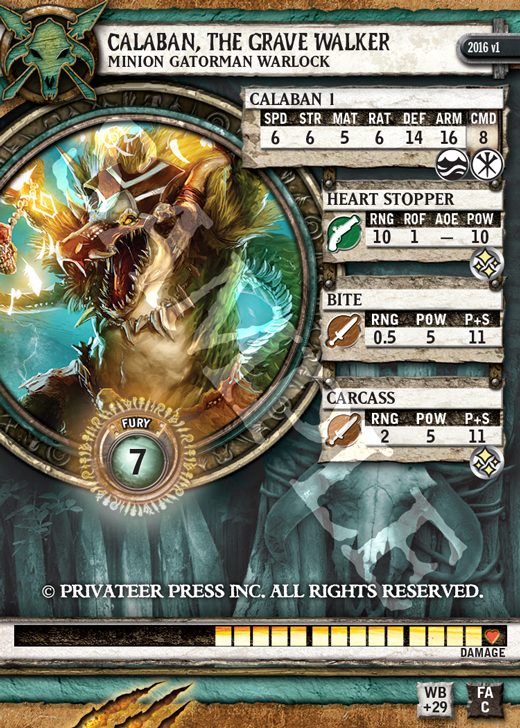 Gatorman warbeasts are still the literal monsters they always were, and have in fact gotten stronger in many places. For example, the Blackhide Wrastler lost his Rise animus—which now exists as a passive ability, sorry Flying Circus fans—and picked up Rage instead. That’s right . . . Rage, as in give a friendly Faction warbeast +3 STR.