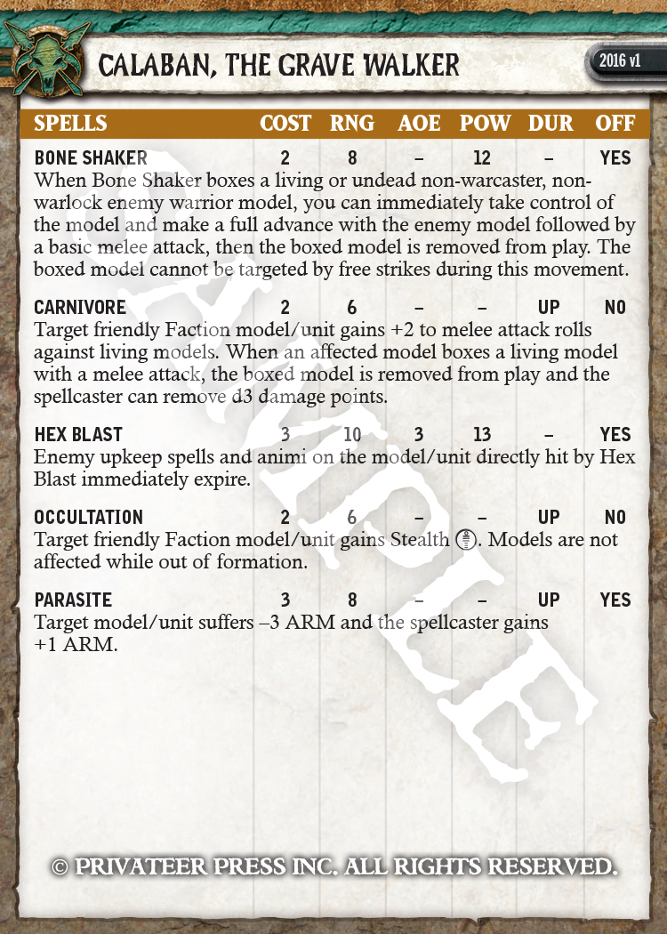 Of course, punching things to death isn’t the only thing that gatorman forces excel at. All of their unique ranged options and their capabilities to cripple the opponent with various forms of death magic remain. In fact, some of their ranged options were tweaked to be even more brutal than before. Take the Croak Hunter. He kept nearly all of his previous abilities with the exception of Hunter, which he traded for Quick Work. There’s nothing like having a potential 17˝ threat with a Poison ranged attack for only 4 points on a Stealth model that’s immune to Corrosion . . . in addition to all of its other advantages.