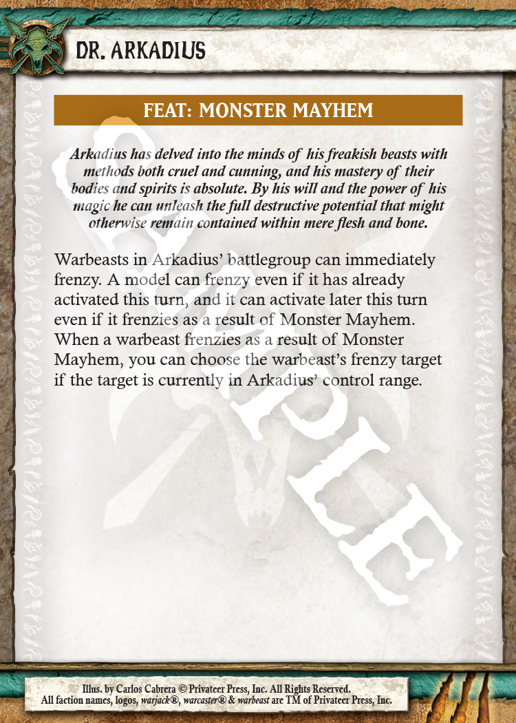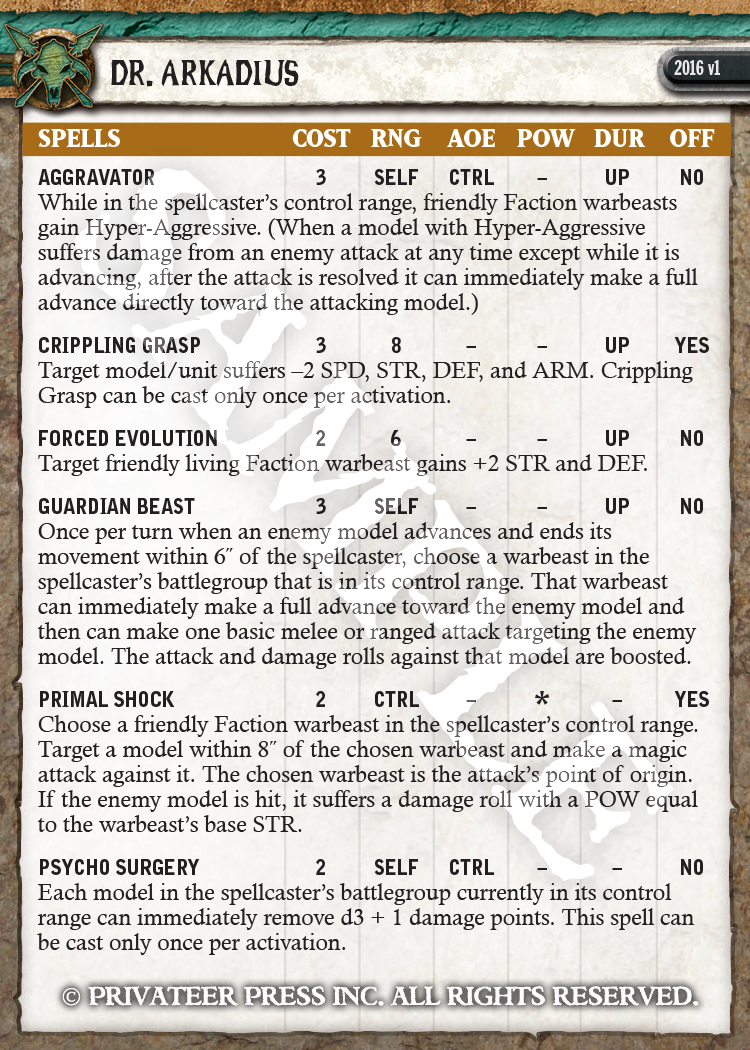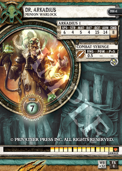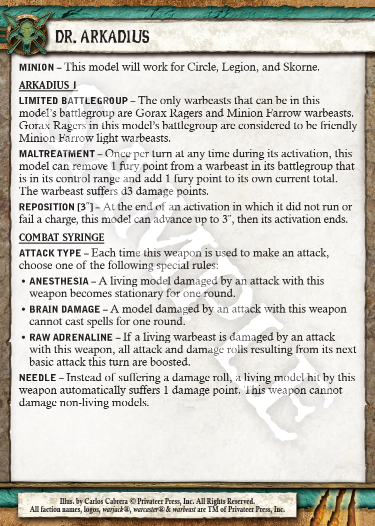 Speaking of the good doctor, Arkadius received a significant overhaul that really defines him as the master of mad science and one of the best Farrow warbeast handlers in Minions. His Combat Syringe comes with a variety of attack types, including one that you want to use on your own models! His Raw Adrenaline attack type reads: If a living warbeast is damaged by an attack with this weapon, all attack and damage rolls resulting from its next basic attack this turn are boosted. Given that his Combat Syringe automatically causes 1 point of damage to the living models it hits, pumping your warbeasts full of Raw Adrenaline is very easy to accomplish. Note that Arkadius isn’t restricted to doing this once per turn—with enough warbeasts in his melee range, he could really unleash some carnage! This is just one example of some of the new, nasty tricks the doctor has picked up in the new edition.