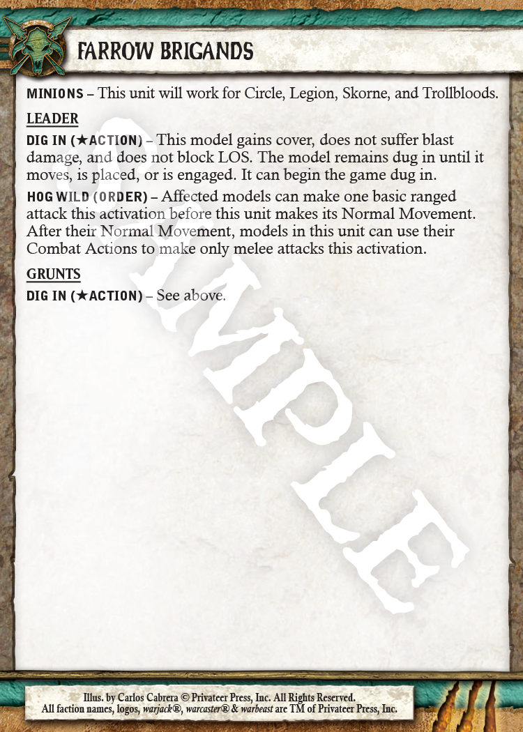 Finally, all of these elements are supported by the farrow ranged elements. These ranged elements can come from warbeasts specifically “fine tuned” to excel at ranged attacks—such as the Gun Boar, whose Big Gun picked up the High Explosive ability and can cause POW 10 blast damage—or from units such as Farrow Brigands. Speaking of Brigands, they sure did get flat-out better. Instead of choosing one of three cool abilities from their list of prayers . . . we just let them have all three. That’s right, they are innately Tough, innately have Pathfinder, and have Hog Wild as an order! See for yourself.