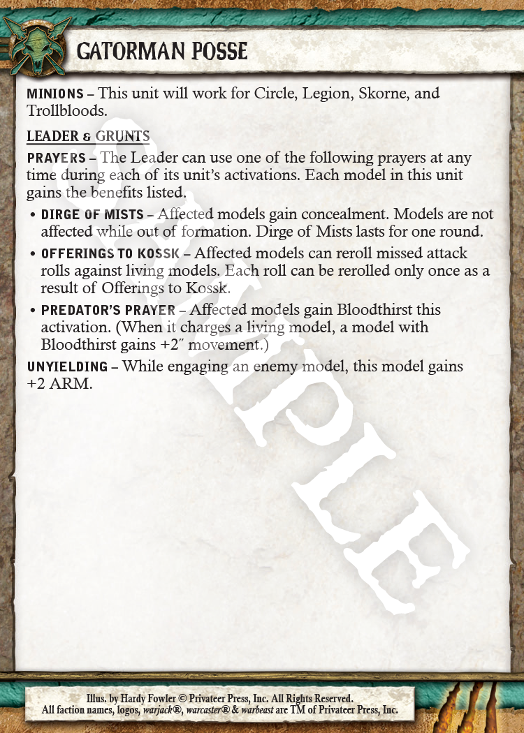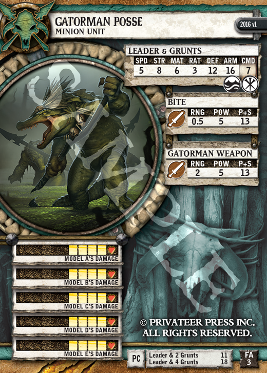 I have to start this by talking about the mainstay of a gatorman-centric army: the Gatorman Posse. It shouldn’t be a surprise that these elite troops were toned down a bit in the new edition. Remember how I said we must ensure that Mercenary or Minion options aren’t so good that they overshadow the options available within the Factions they work for? Yeah, the Gatorman Posse was a prime example of that problem. So yes, the Posse was toned down with a reduction in MAT, the loss of a few damage boxes like most heavy infantry received, and a re-evaluation of its prayers. But they (like all living gatormen in Minions) did pick up Tough to better represent their hardiness. It’s hard to look at this unit and think it isn’t still absolutely brutal and a great value for its points. I would easily give it a final grade of “Still Baller.”