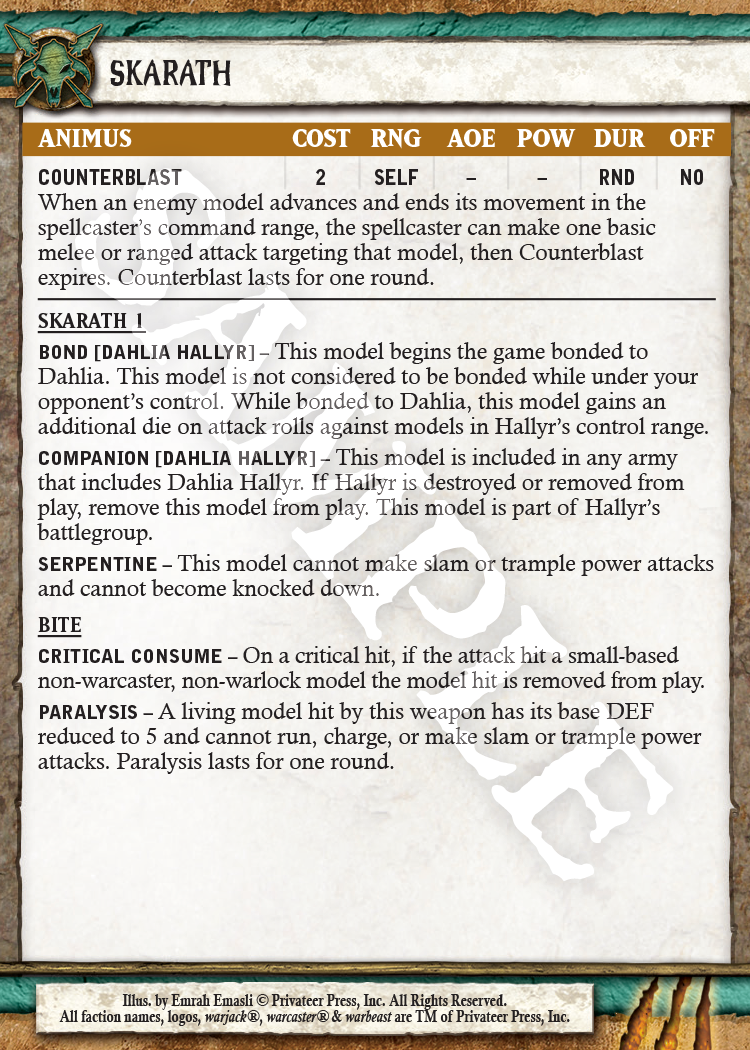 You might want to start by taking a look at all of the Minion models that you previously couldn’t use in a Minions army and reassess their value. Wait, that might be difficult since you don’t have the cards. Well, put it high on your priority list when those cards do release. For example, Dahlia Hallyr & Skarath, who were previously unusable in a Minions army, are now a valid and devastating option. While Dahlia hasn’t changed too much, Skarath picked up a point of ARM, a point of RAT, Gunfighter, a new animus, and an insane Bond. Who doesn’t want boosted attack rolls on a 10˝ spray attack that causes Corrosion? I know I do.