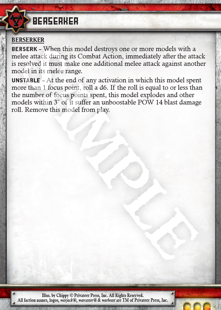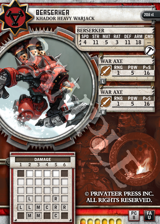 But what you really want to know about are the warjacks, so let’s start with the venerable Berserker. Age before beauty. The change to Power Up pretty much mandated an update to the Unstable special rule. which also made Aggressive feel dated. So, we made a few minor changes . . .