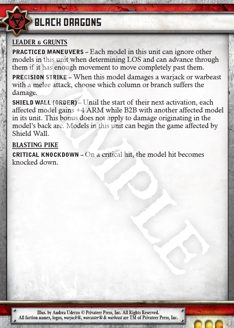 Returning to Khador’s units, we focused in a little more narrowly on the Iron Fangs, who we have always seen as an elite infantry unit. To reflect this, the Pikemen and the Uhlans both went up to MAT 7. They also lost a point of DEF since their battlefield tactics and heavy armor do not generally lend themselves to evasion.