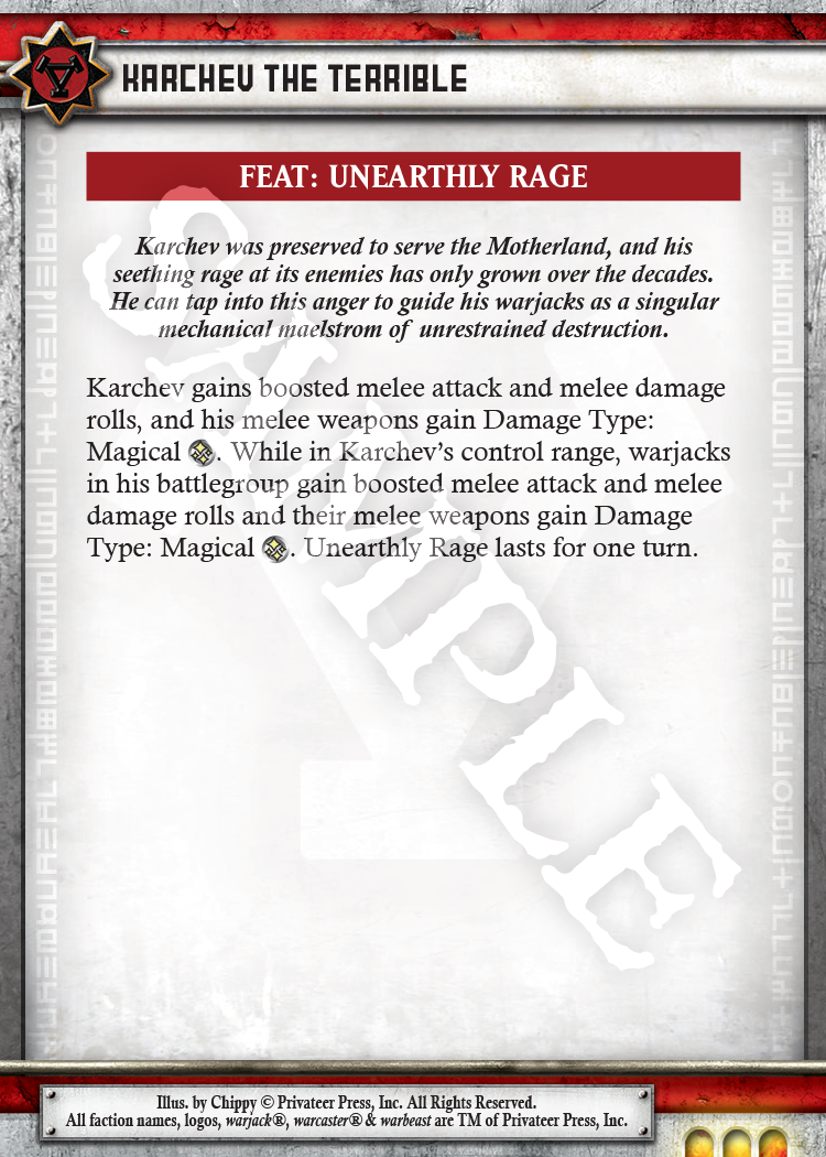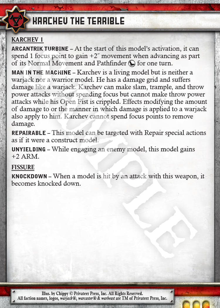 We also significantly reworked Karchev, and this one is bound to be met with some grumbles. Yes, he is different, and those of us that remember his Mk I incarnation will certainly bemoan some of the change in flavor. I do, too. That said, I think we have achieved a brutally effective man-in-the-machine. This version of Karchev is a steamroller. Yes, his power slide is gone, and honestly we got sick of seeing him turn his back on the enemy or huddle up with warjacks until he had the DEF of a ballet dancer. This Karchev kills—every blasted thing in his path.