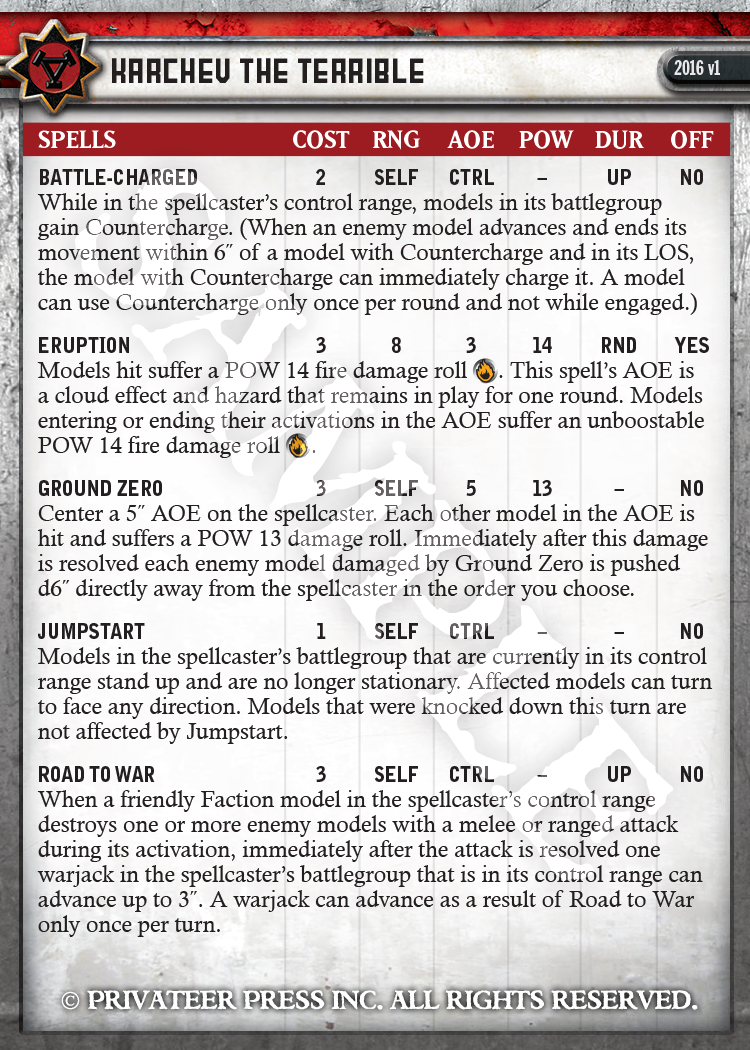 First, I want to honestly say I do not remember a time when Kommandant Irusk did not have Battle Plans. I mean, I am looking at the Mk II Forces of WARMACHINE: Khador book, and it is really weird not to see it there. How did you guys live before Irusk had Battle Plans? Doesn’t that just feel natural? Irusk is also the only model in the game that still has the Inhospitable Ground spell. We decided out of all the warcasters and ’locks in the game, this was the guy who would always choose his battlefield.