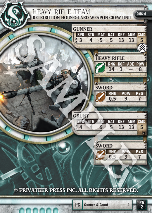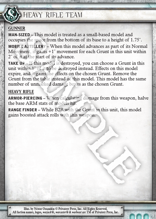 Adding to the hail of accurate sniper fire in this list, the Ghost Snipers have really become another favorite of mine in the new edition. While it may not jump off the page, the Ghost Sniper’s Marksman ability, which allows it to choose the column or branch of a warjack or warbeast it hits, pairs incredibly well with Deadly Shot. I can’t count how many times I’ve barely missed crippling an enemy warjack’s cortex or movement during an important turn due to a bad location roll. Well, no more! In this list the Ghost Snipers act as the cleanup crew for the Heavy Rifle Teams. If there’s nothing to clear, then the Snipers take out key solos or support units. The general rule of thumb, however, is to always save their activations until near the end of your turn. That’s when their abilities really shine best.