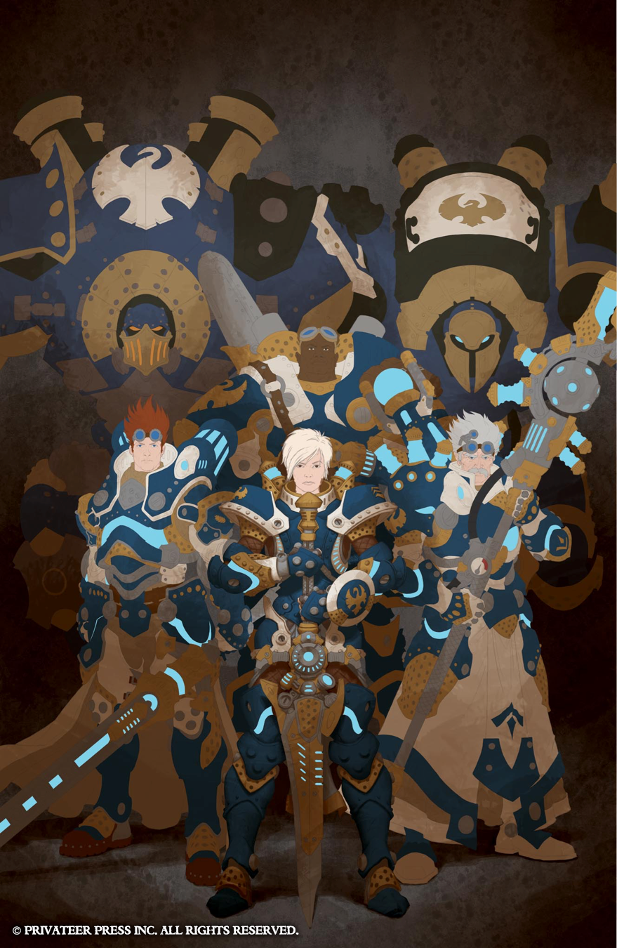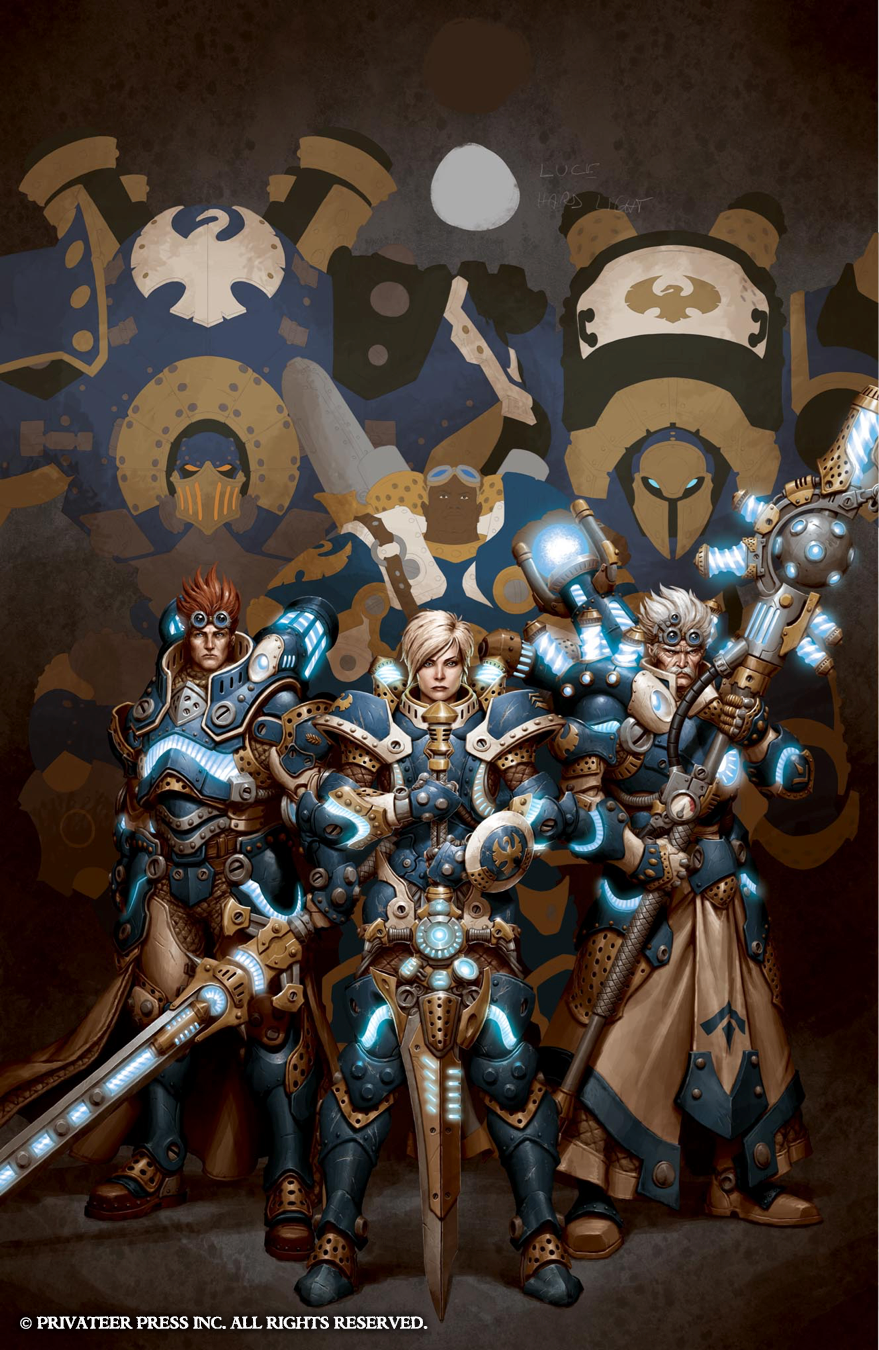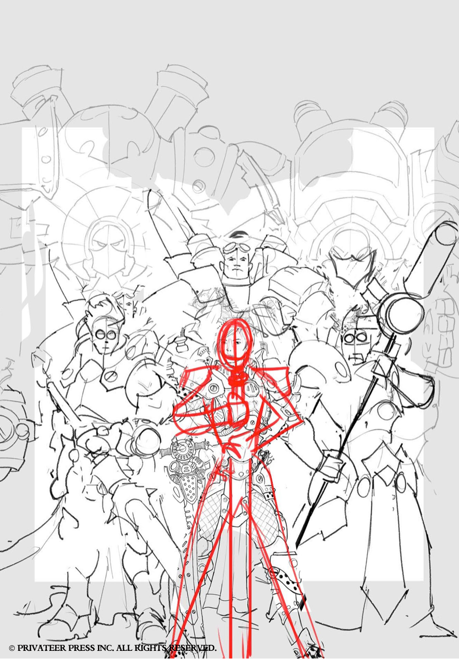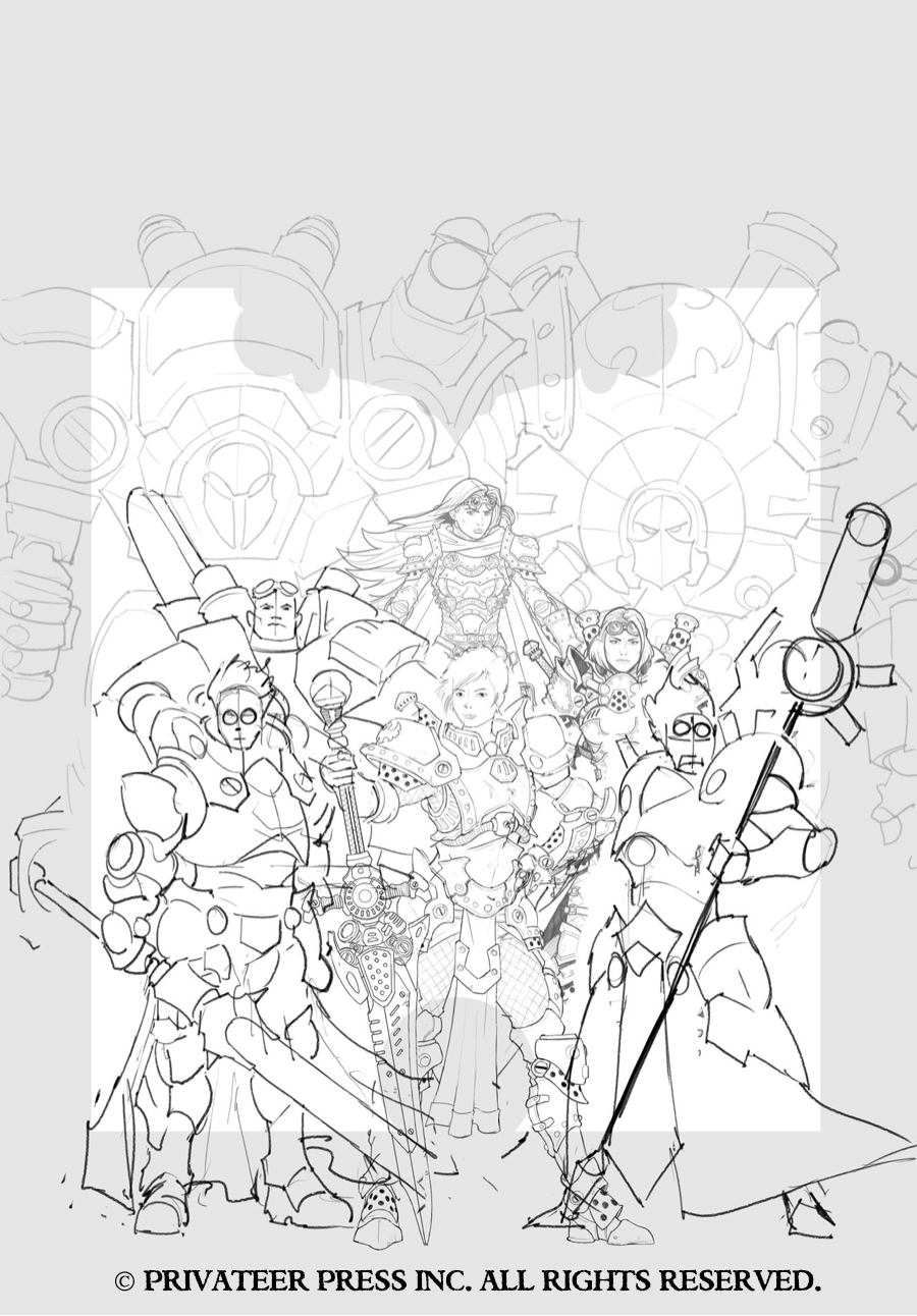 In this art Insider, I’ll do more showing than telling, as each Command book cover is very straightforward. The direction we’ve taken for these books is to showcase our new warcaster or warlock, putting that character front and center surrounded by a few other classic warcasters or warlocks and with a couple of warjacks or warbeasts in the background. The idea behind each composition is similar to that of the wall of heroes visuals from DC Comics’ old Kingdom Come covers in which you get a clear view of several iconic characters.