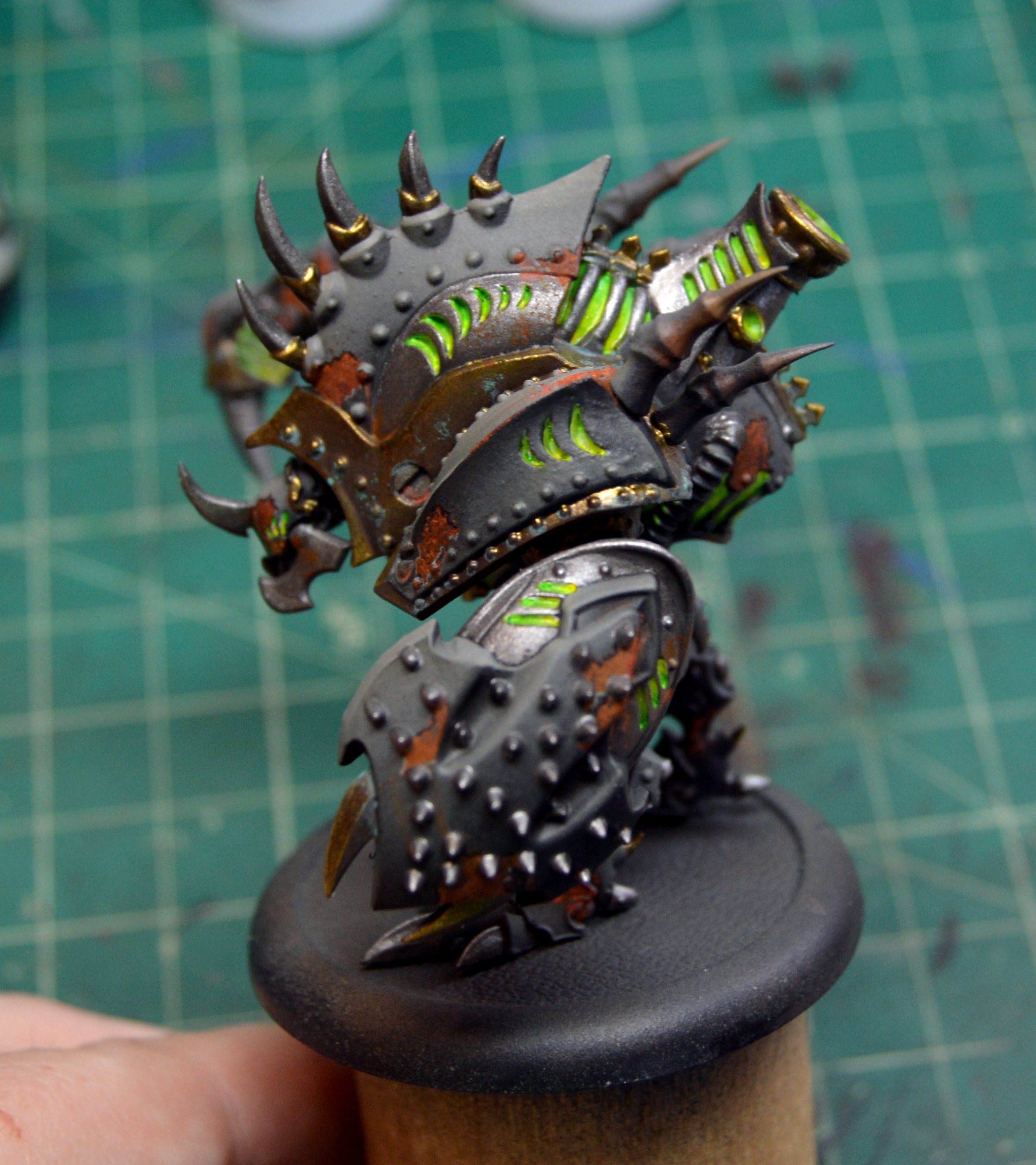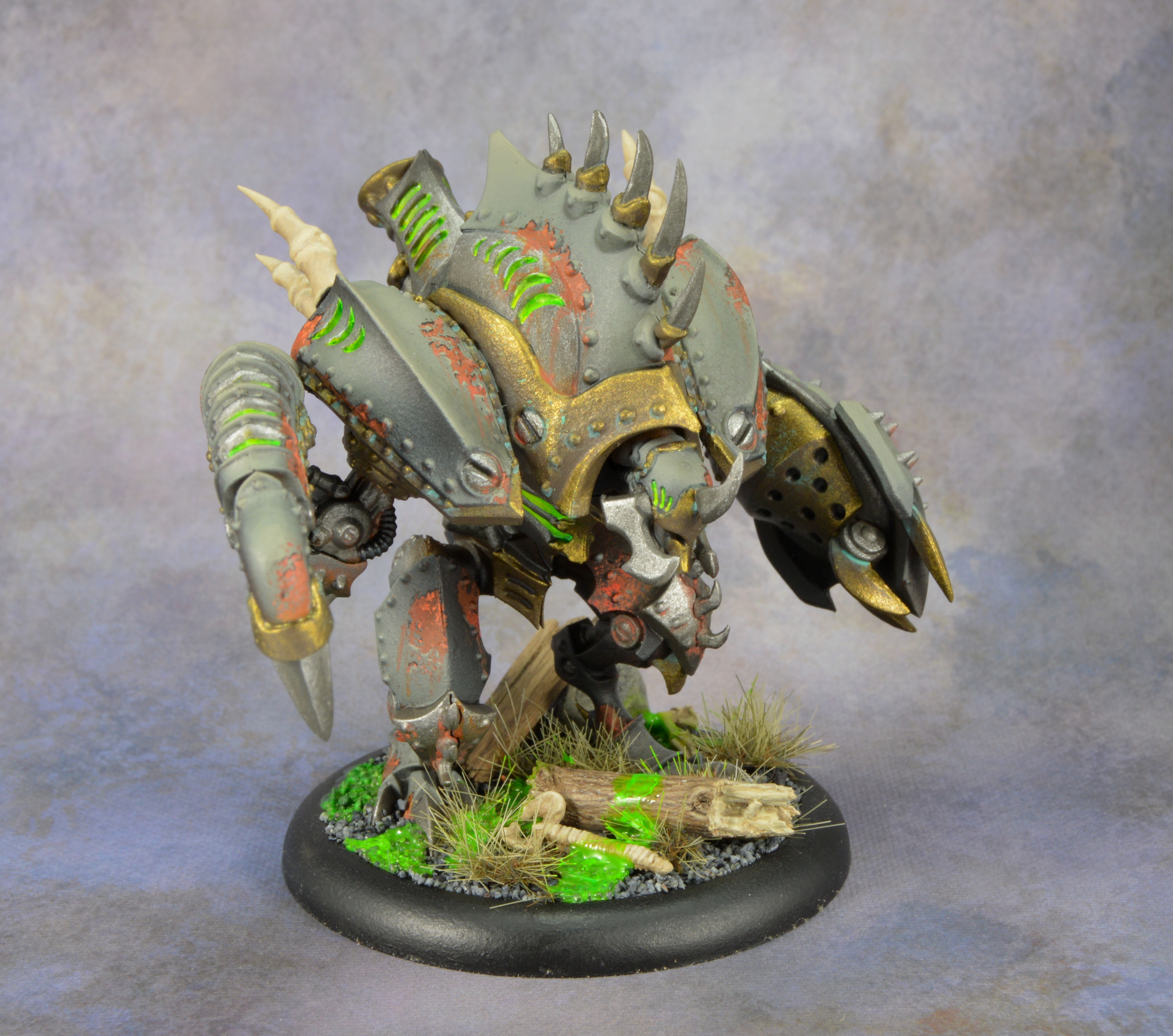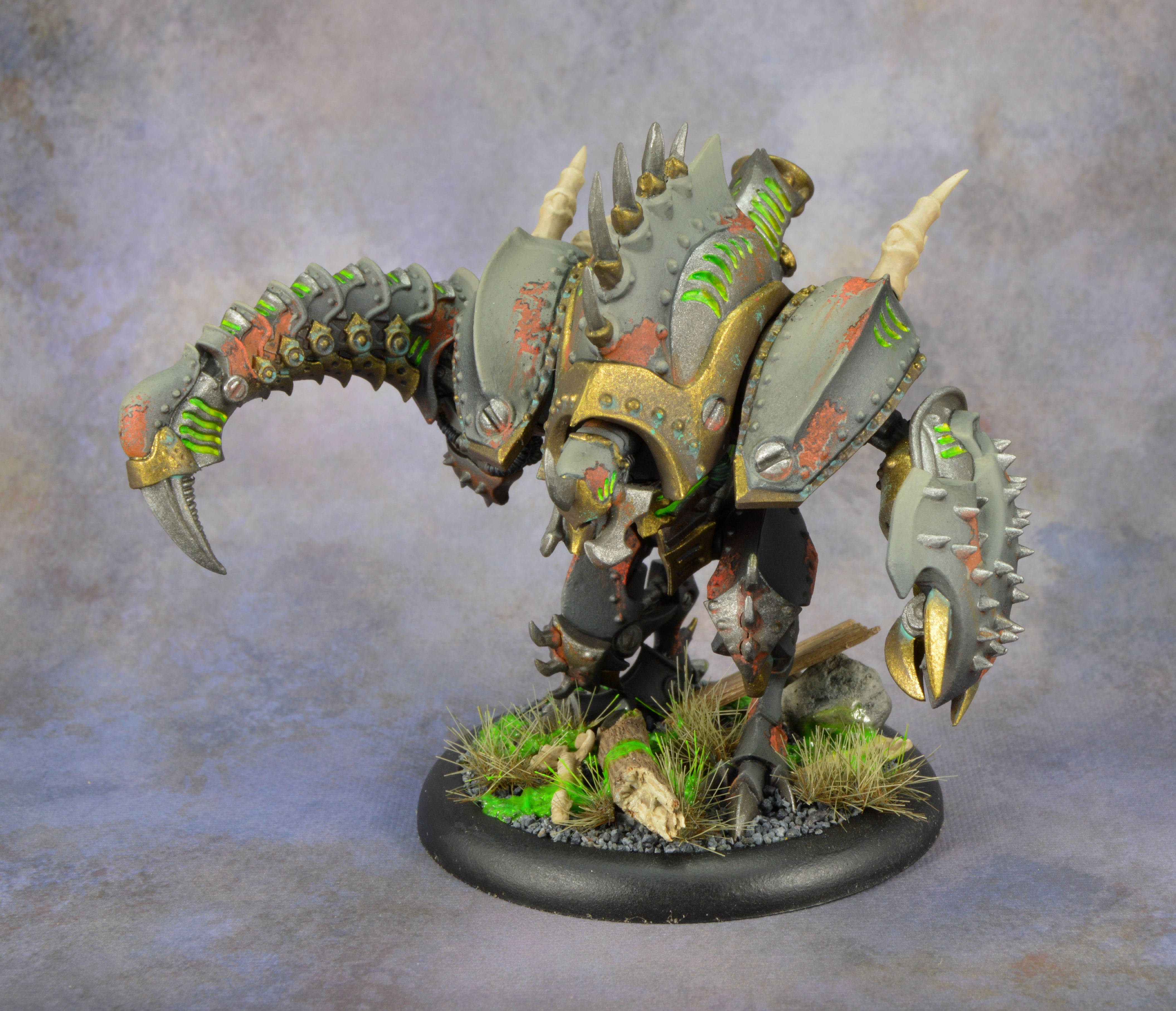 Almost there! All that’s left at this point is a few hoses and the boney shoulder spikes. Paint the hoses black and highlight the ridges with Coal Black mixed with a bit of Menoth White Highlight. The bone spikes are a ‘Jack Bone base, shaded with a 50/50 mix of Gun Corps Brown and Cryx Bane Highlight, then highlighted with a mix of ‘Jack Bone and Menoth White Highlight.