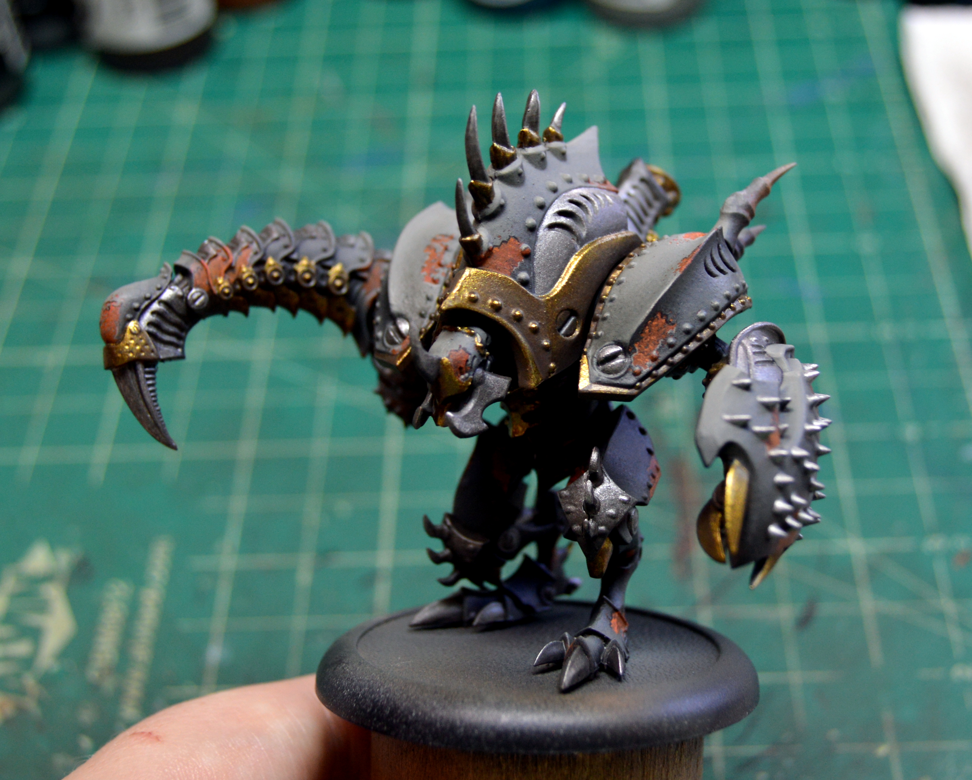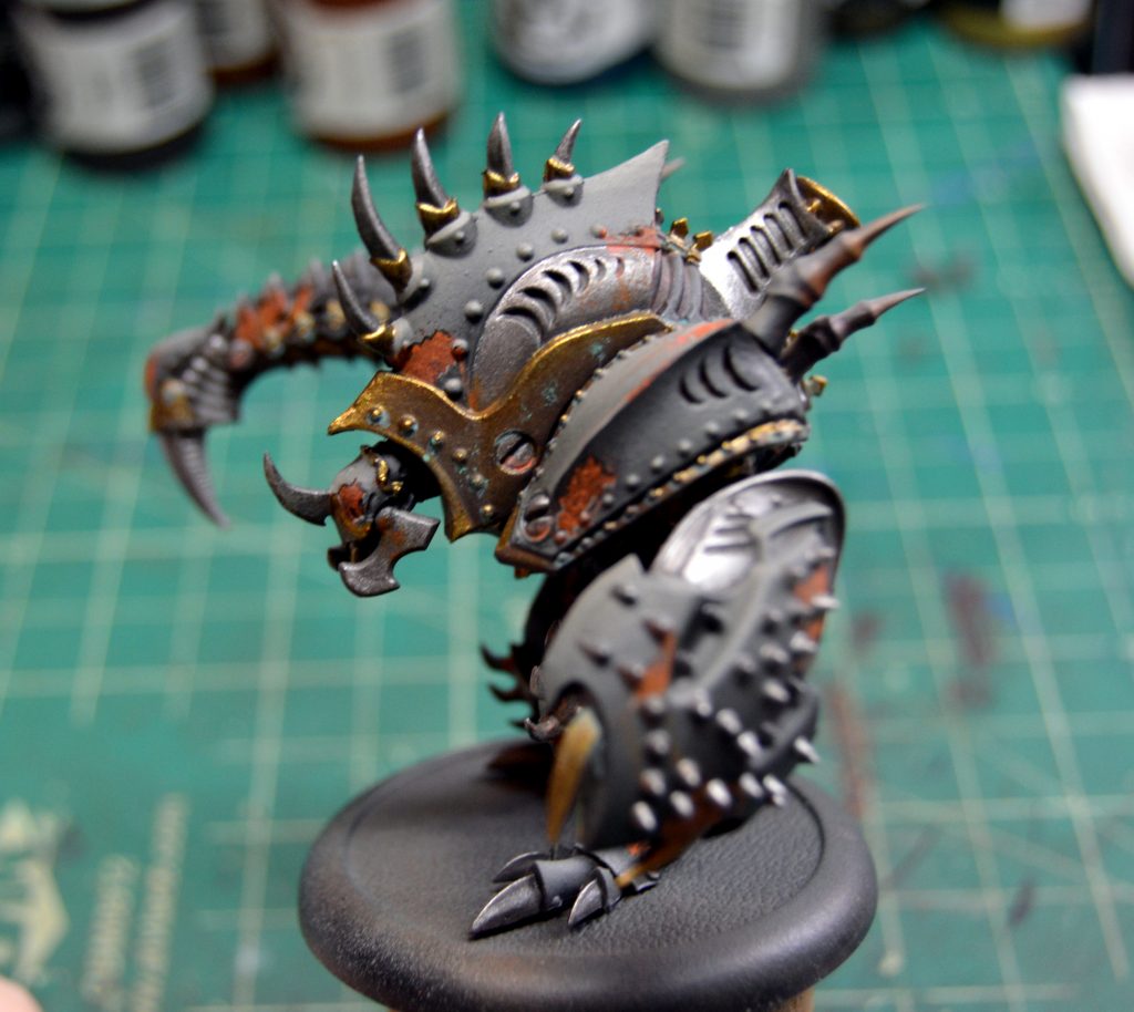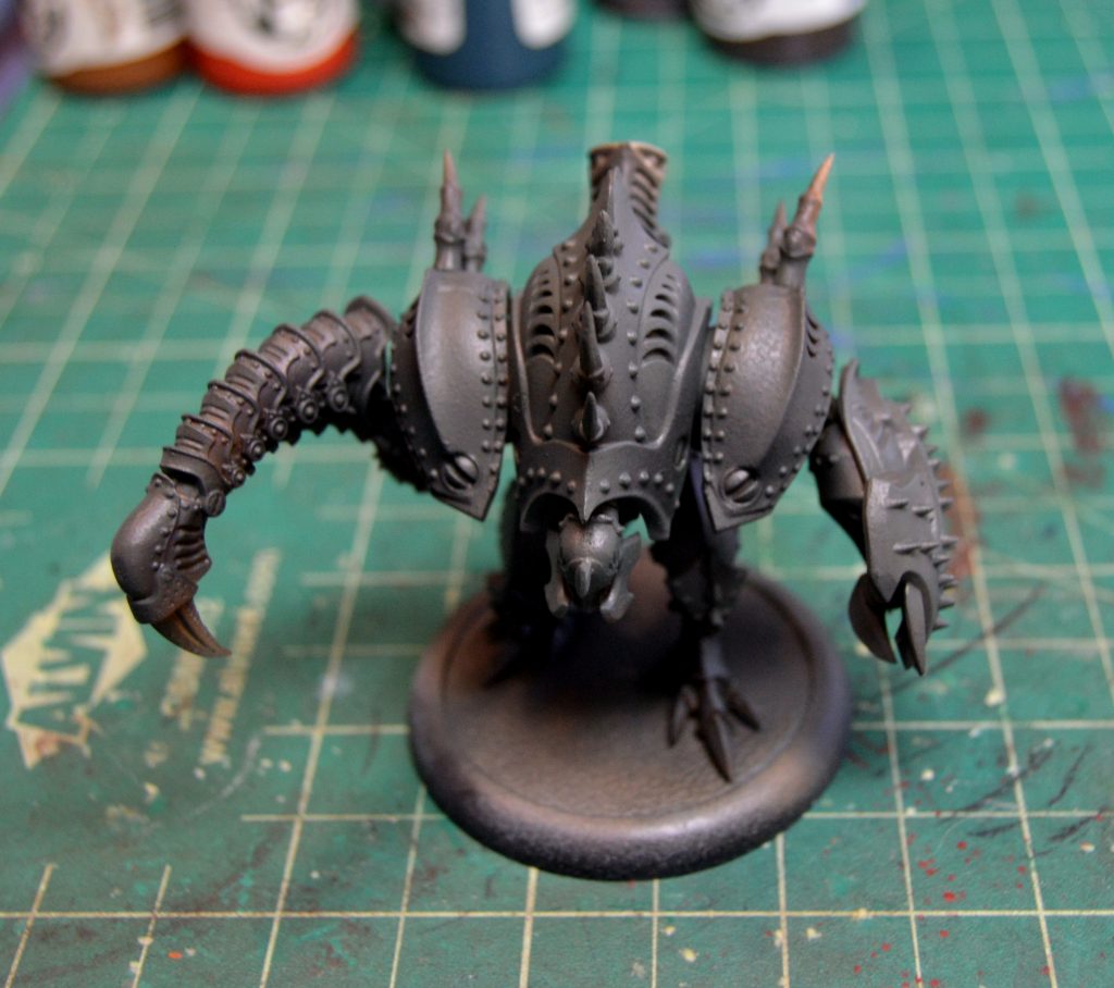 Almost there! All that’s left at this point is a few hoses and the boney shoulder spikes. Paint the hoses black and highlight the ridges with Coal Black mixed with a bit of Menoth White Highlight. The bone spikes are a ‘Jack Bone base, shaded with a 50/50 mix of Gun Corps Brown and Cryx Bane Highlight, then highlighted with a mix of ‘Jack Bone and Menoth White Highlight.
