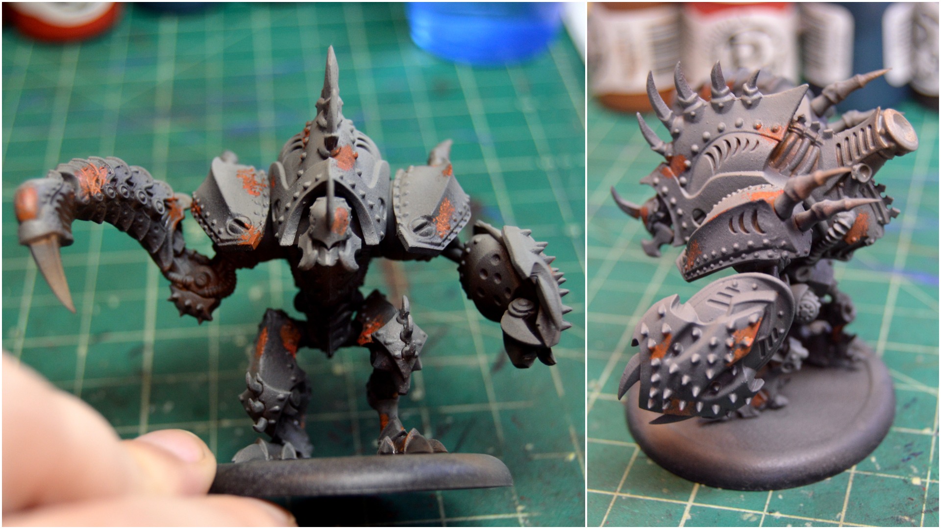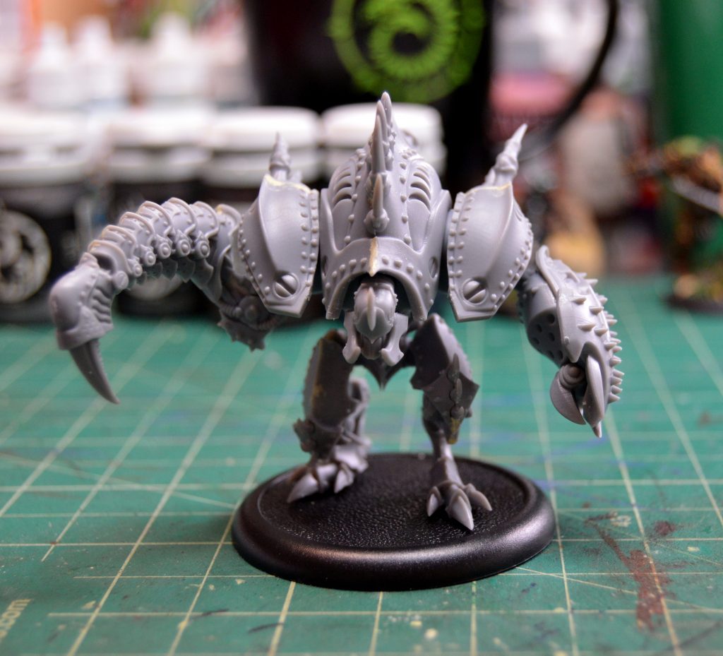 Assemble the warjack according to the instructions, remove mold lines with a sharp hobby knife, and fill the gaps with an epoxy material of preference. It is important to note that I failed on the following instructions part, and didn’t notice that the Inflictor should have two small acid tanks on its right shoulder instead of another set of spikes. So mine has two sets of shoulder spikes… oops!