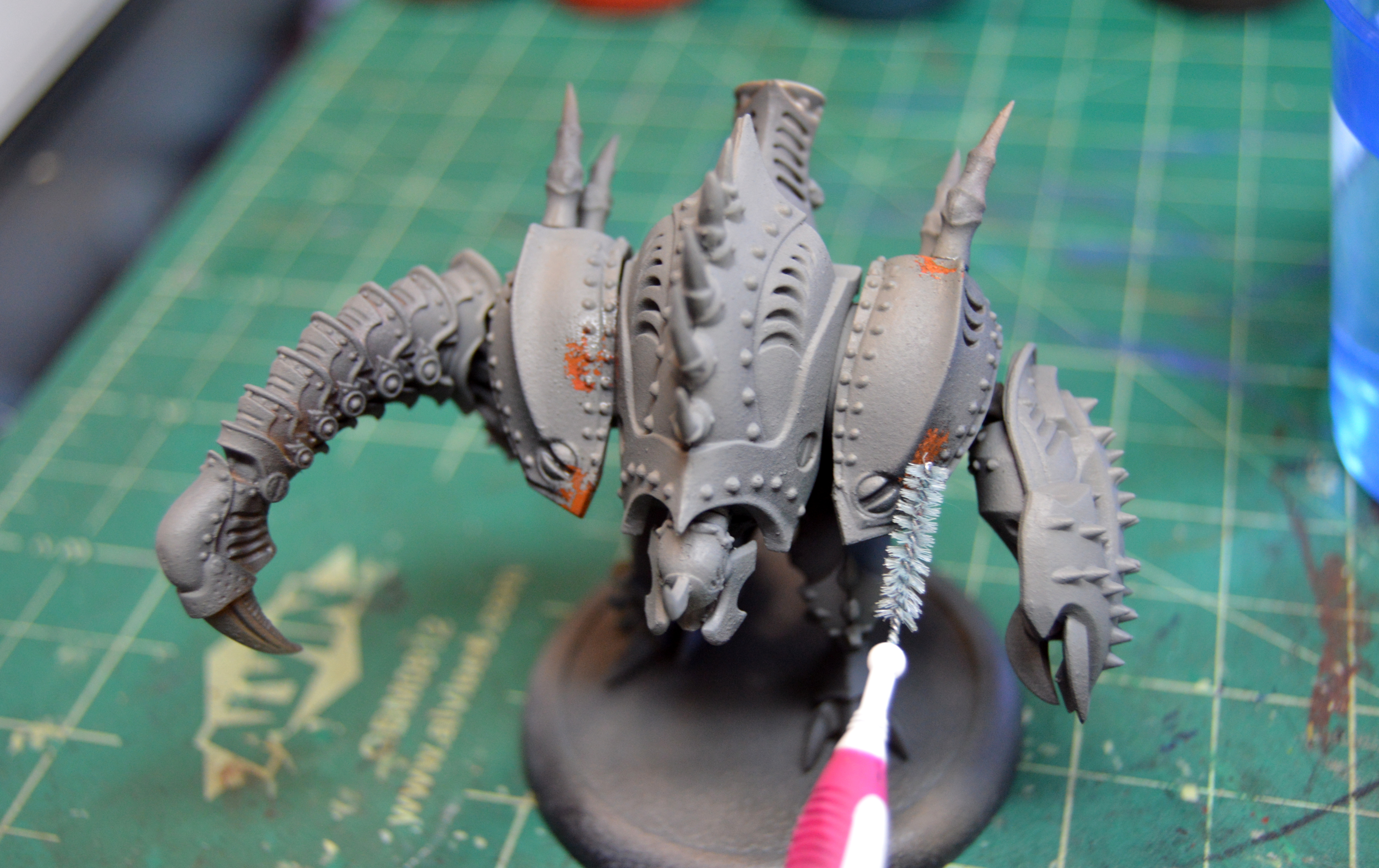 Prime the model in a light gray or white primer using an airbrush or a rattle can variety. A lighter primer is important here because it helps the next step, a rusty orange, show up vibrantly.