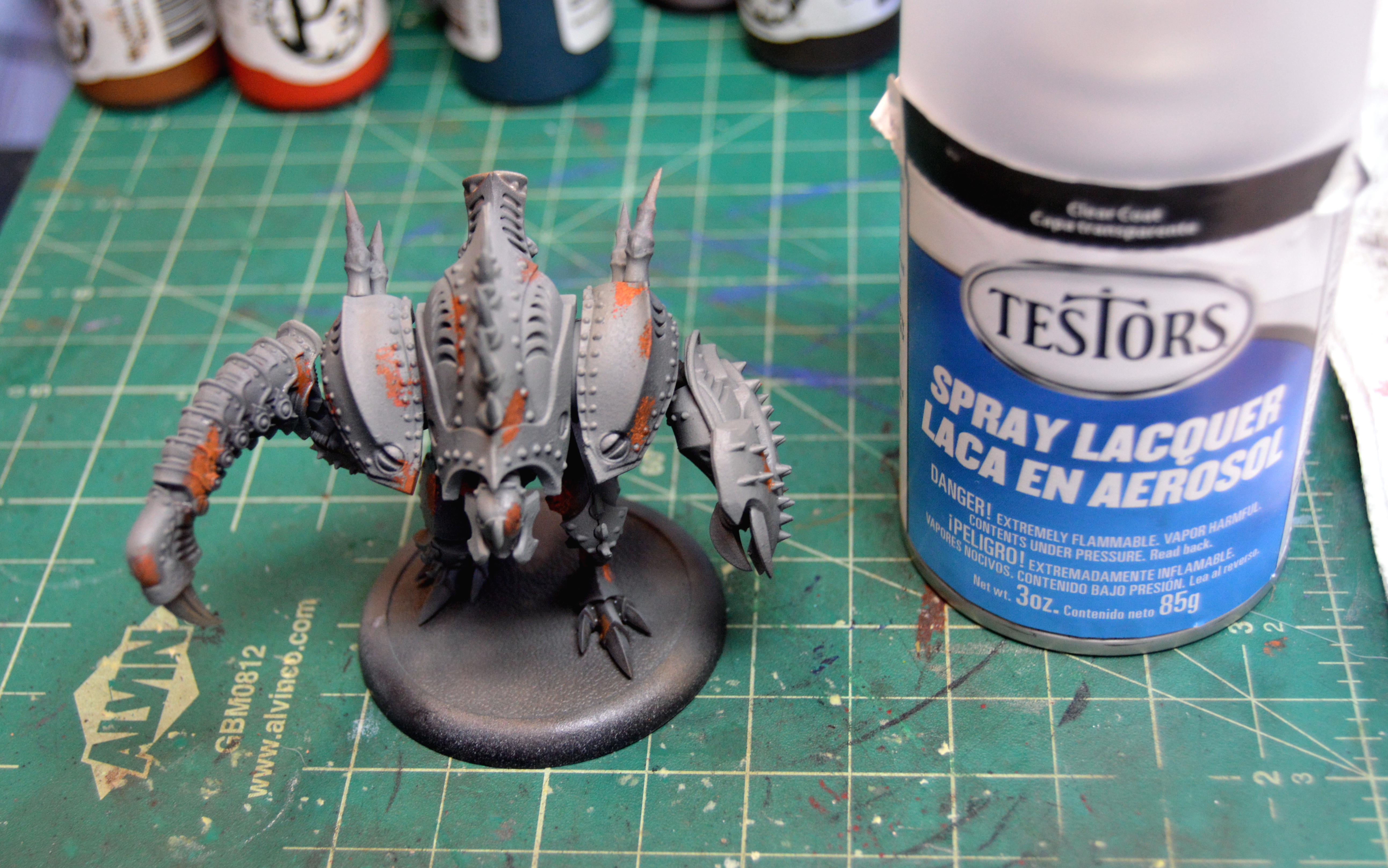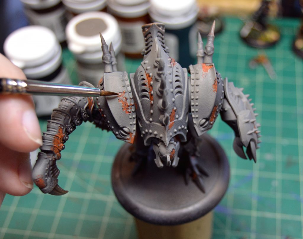 At this point, I sealed the Inflictor lightly with some Testor’s Dullcote, a spray matte varnish, to protect the rust layer in the next steps. After that had fully dried, take whatever cheap aerosol hairspray and apply two light coats to the model, letting it dry fully between coats. A hairdryer on a cool setting can speed up the drying time significantly. It is possible that the hairspray will make the model look shiny, but this is fine as it won’t stay that way.