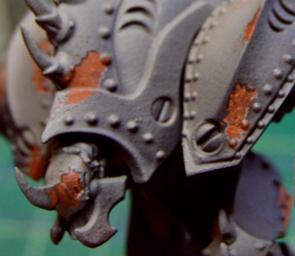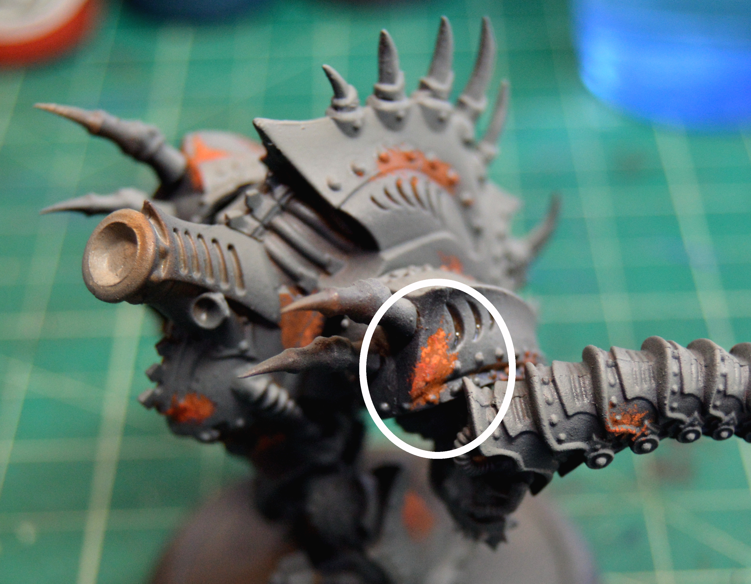 To really make the rust stand out it needs to be edged. To simulate the effect of paint lifting from the rust, paint a fine Thamar Black line around the top edge of the spot, so it looks like it’s casting a shadow. Use Cryx Bane Highlight to paint a thin, light line around the bottom edge of the rust spot, as if the peeling paint edge is catching the sunlight.